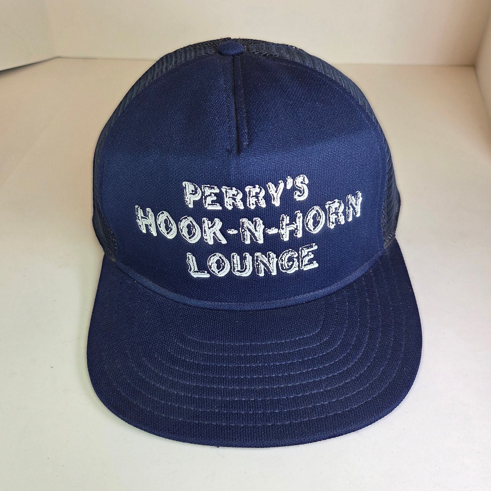 Add some character to your collection with this unique ?Perry?s Hook-N-Horn Lounge? trucker hat. The bold white embroidery on the navy foam front gives it a true retro bar-promo look, but the origins of the lounge itself remain a mystery. With no records of the business to be found, this cap doubles as both a stylish vintage-style snapback and a conversation piece for collectors who love the obscure.