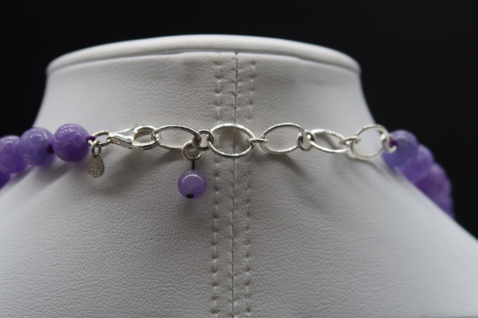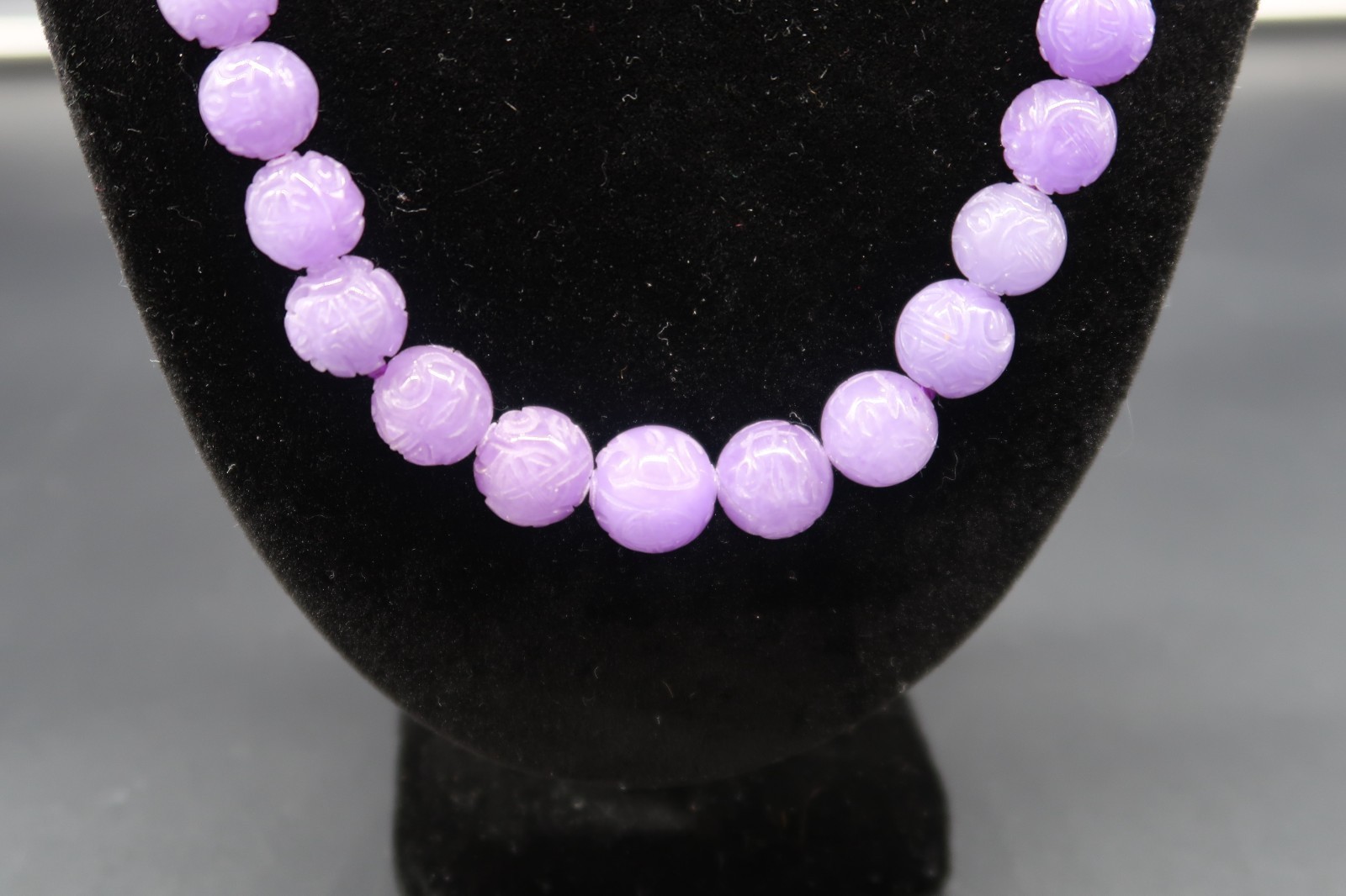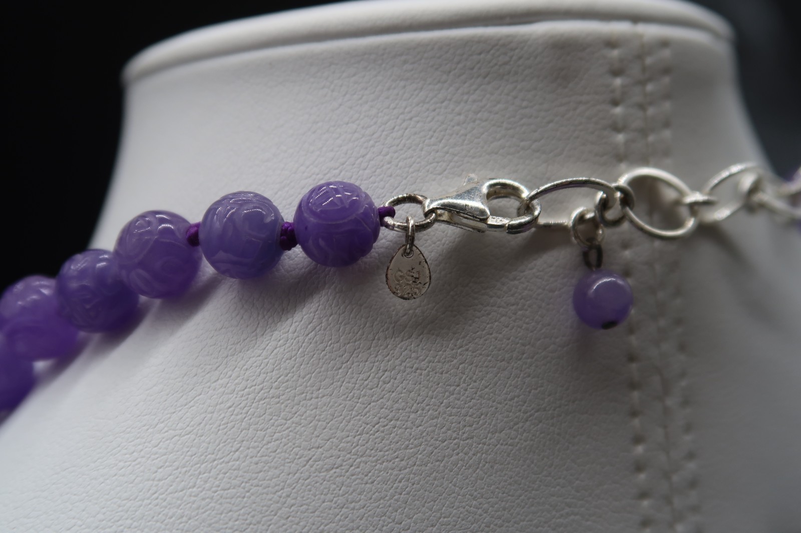Vtg Carved Purple Jadeite Jade Necklace Graduating Sterling Clasp GSJ 20"