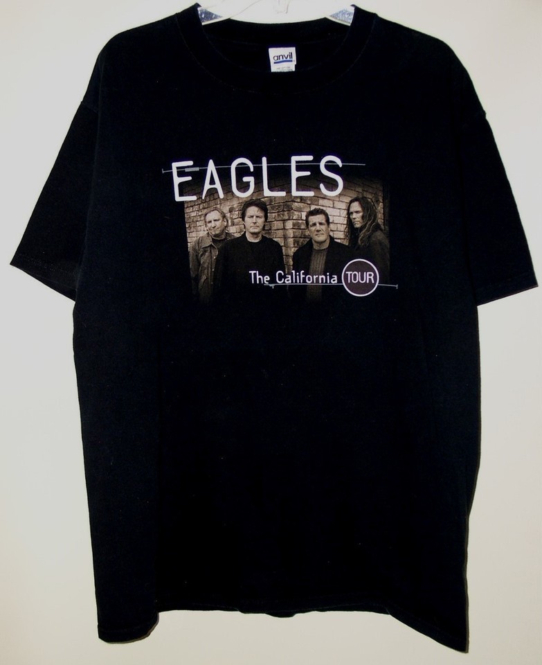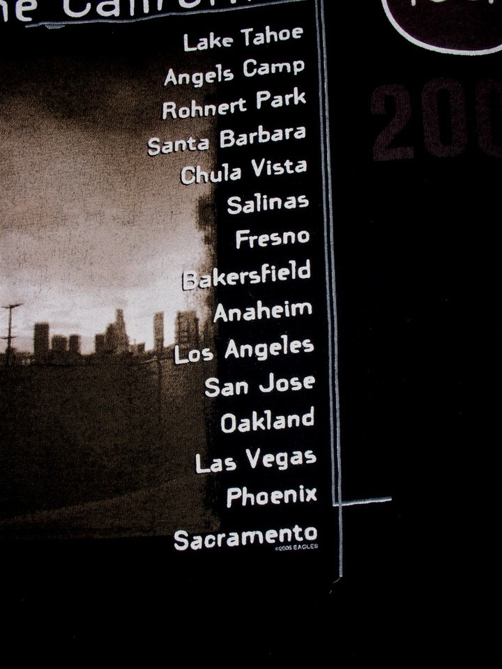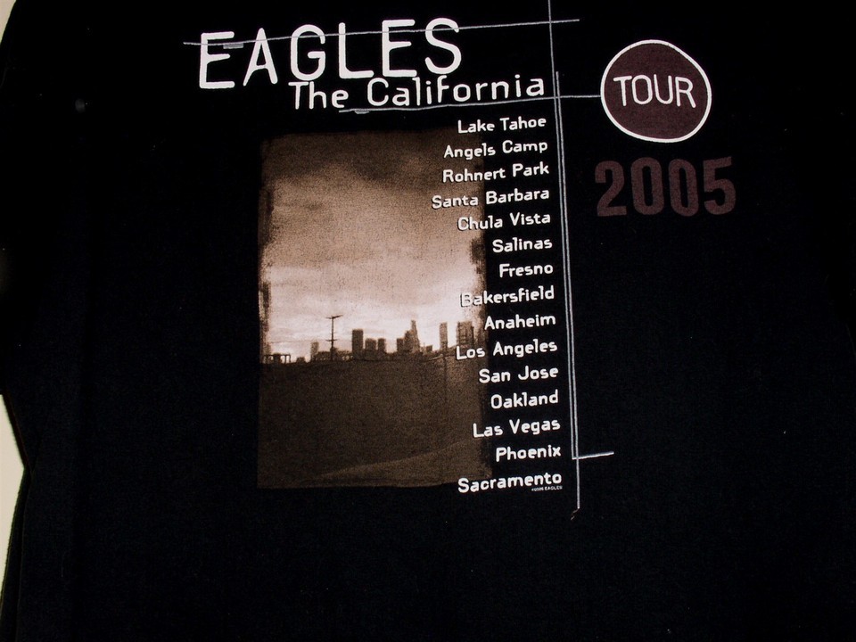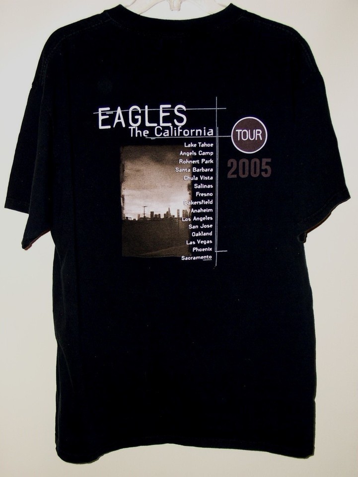 This is a vintage concert tour t shirt entitled, "Eagles The California Tour 2005". Dated 2005 Eagles. Cities listed on the back makes this all the nicer. Tag reads: Anvil Knitwear. A terrific item for the fan or collector.
