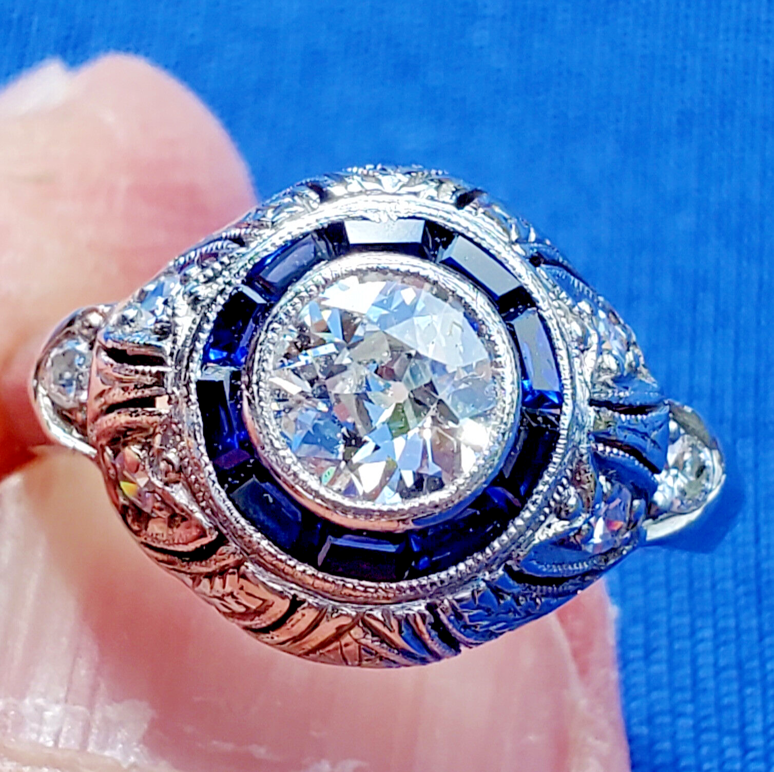 Earth mined Diamond Sapphire Engagement Ring 1.40 carat Deco Platinum Solitaire