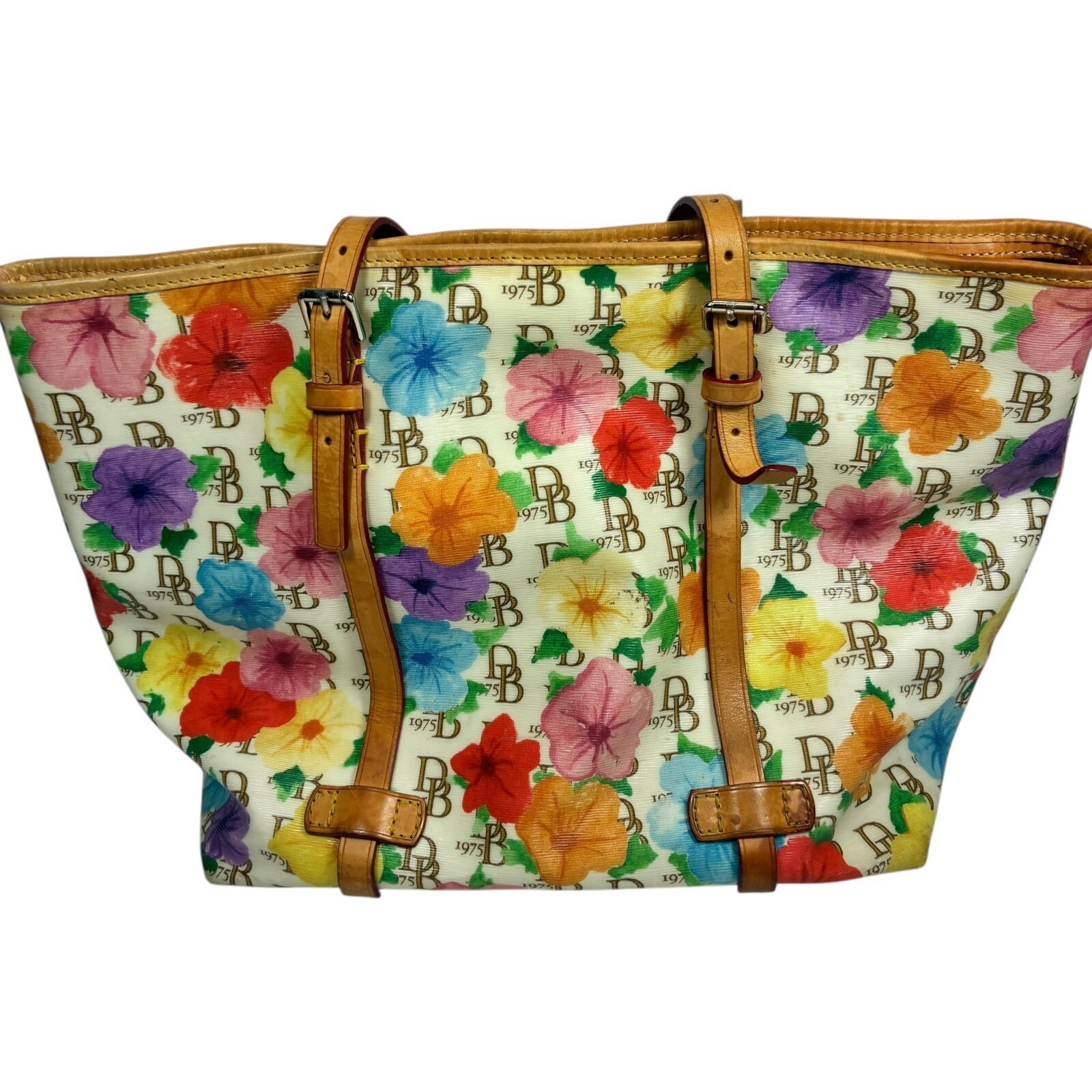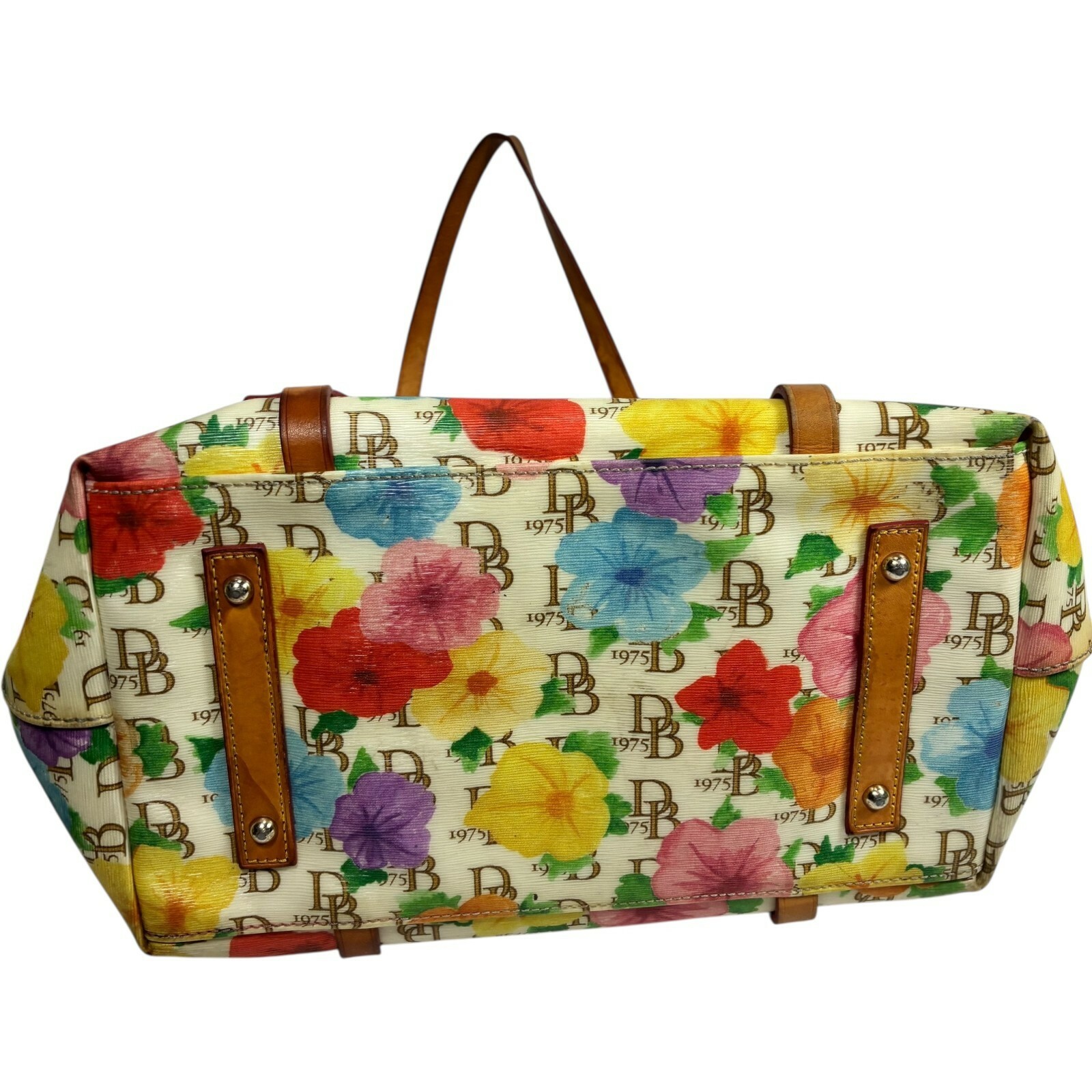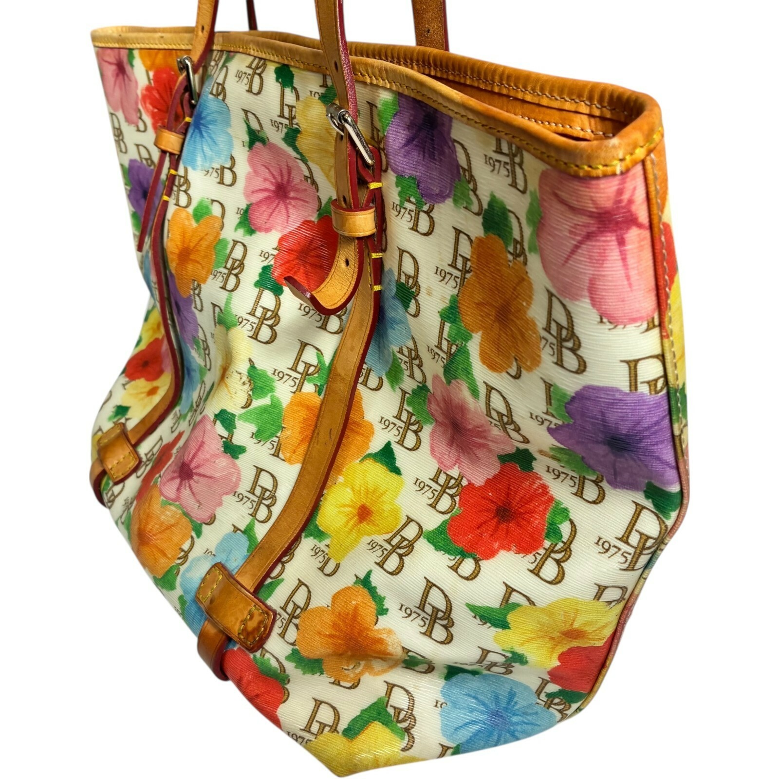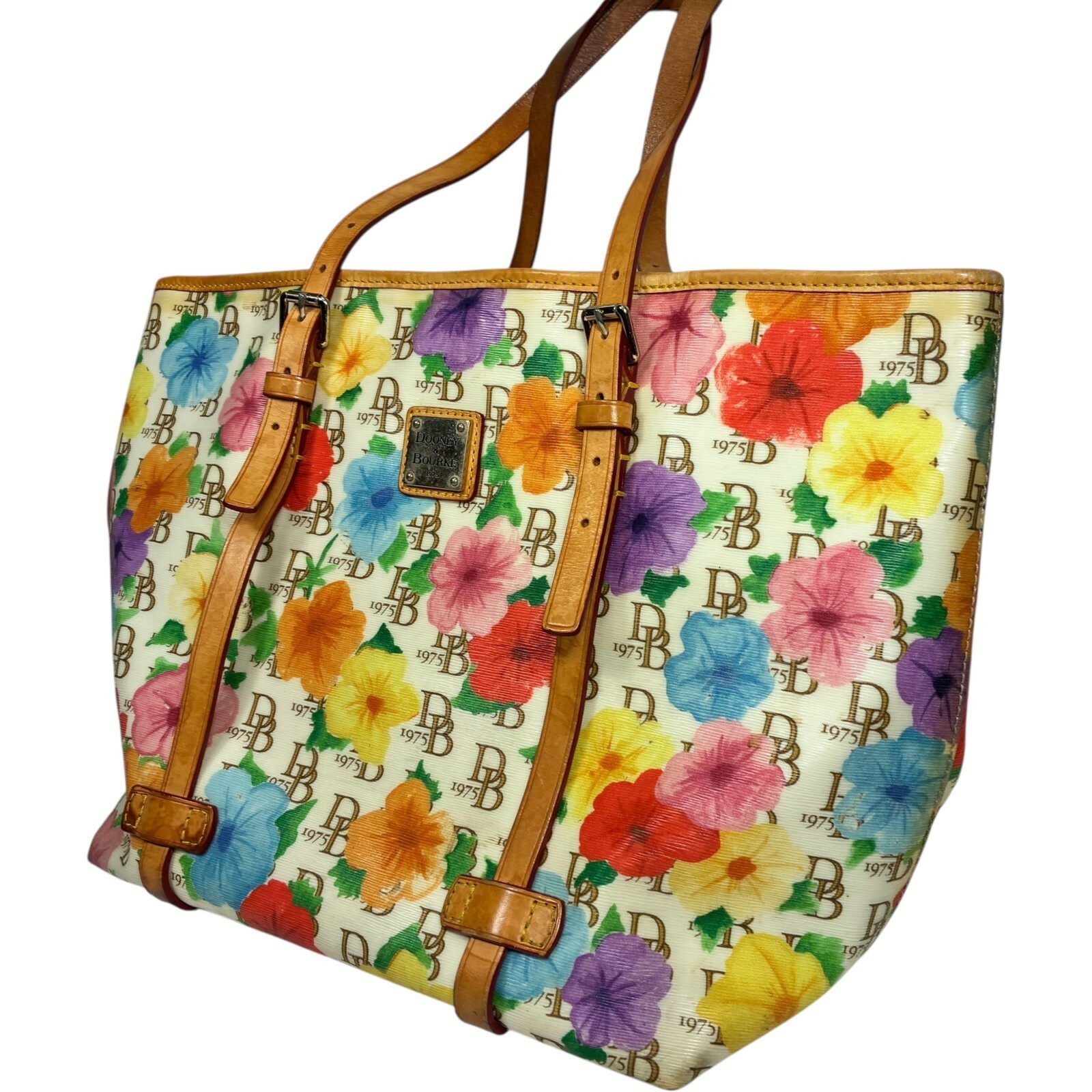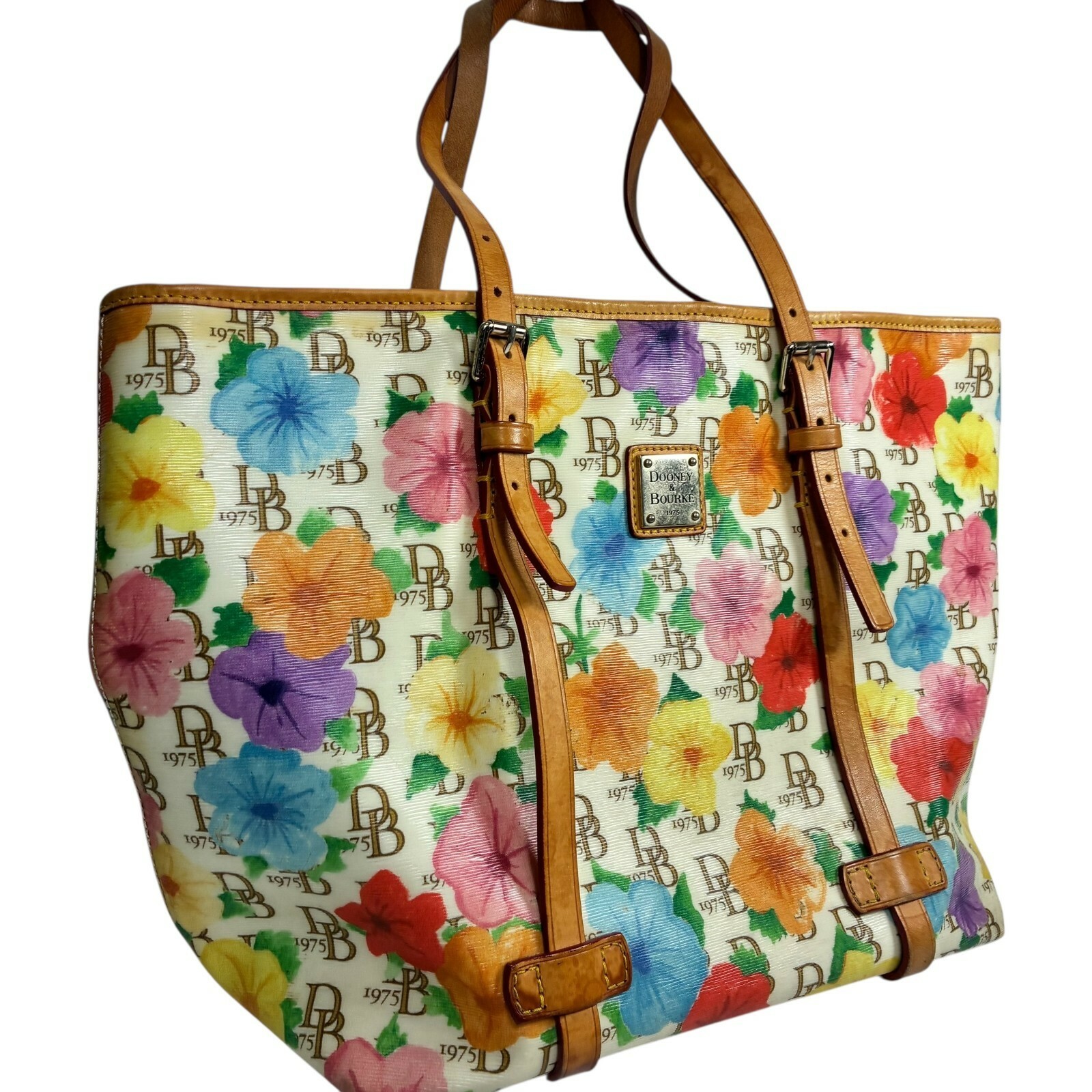 VTG Dooney Bourke Hibiscus Floral PVC Large Shoulder Bag Tote Tan Leather Straps