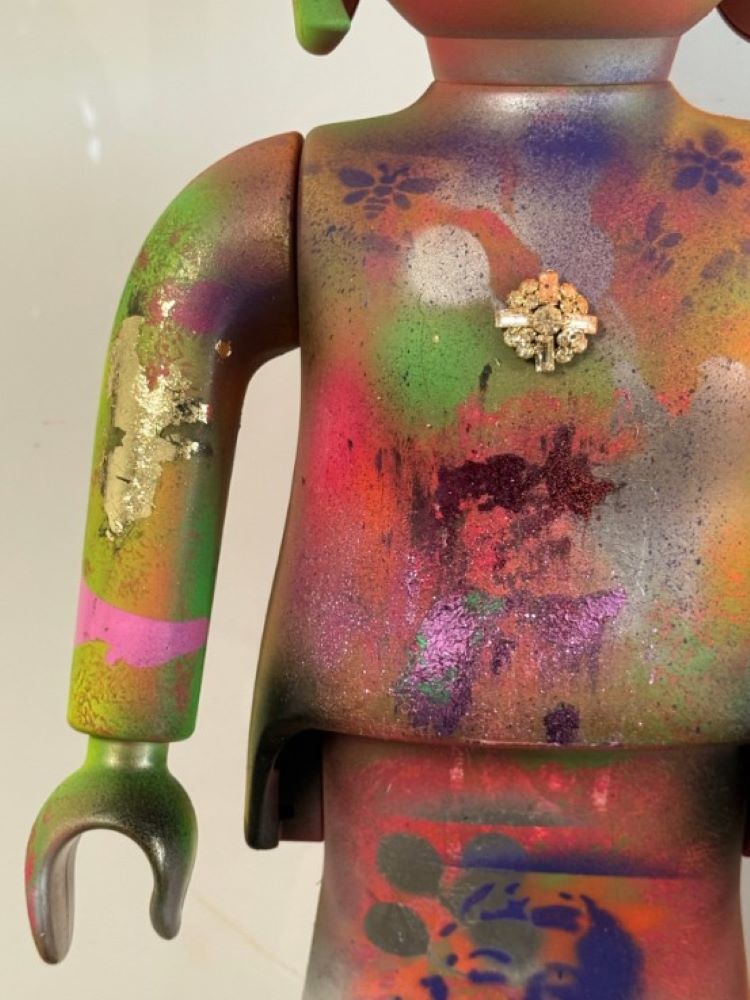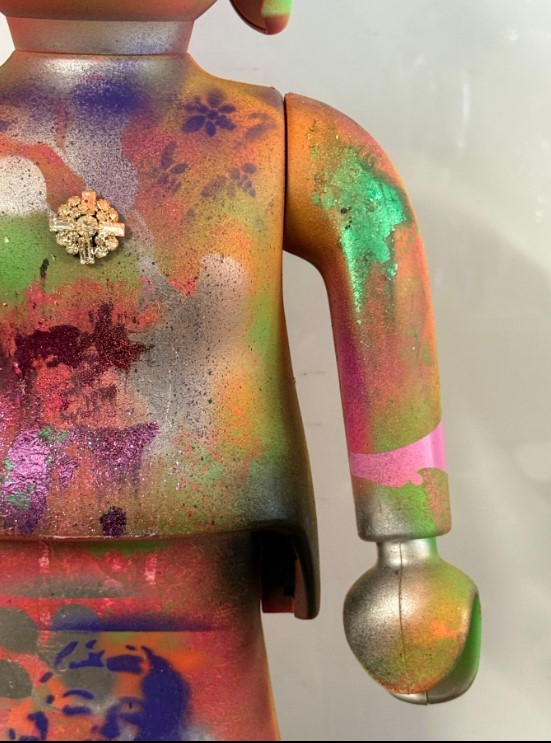 Medium / Technique: 3D object, mixed media (spray paint, stencil, glitter, brooches, golden detailing)