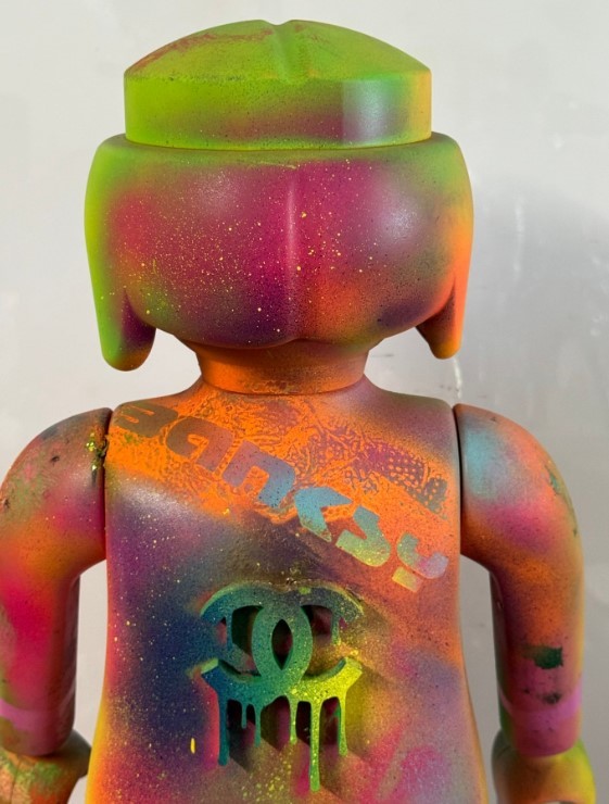 This is a one-of-a-kind (1/1) creation by Daluxe Art, titled “1999 · GAME OVER” (Playmobil Lady). The piece is a hand-crafted mixed-media pop-art object, reimagining the iconic Playmobil figure with luxury-inspired details, playful colors, and layered textures.