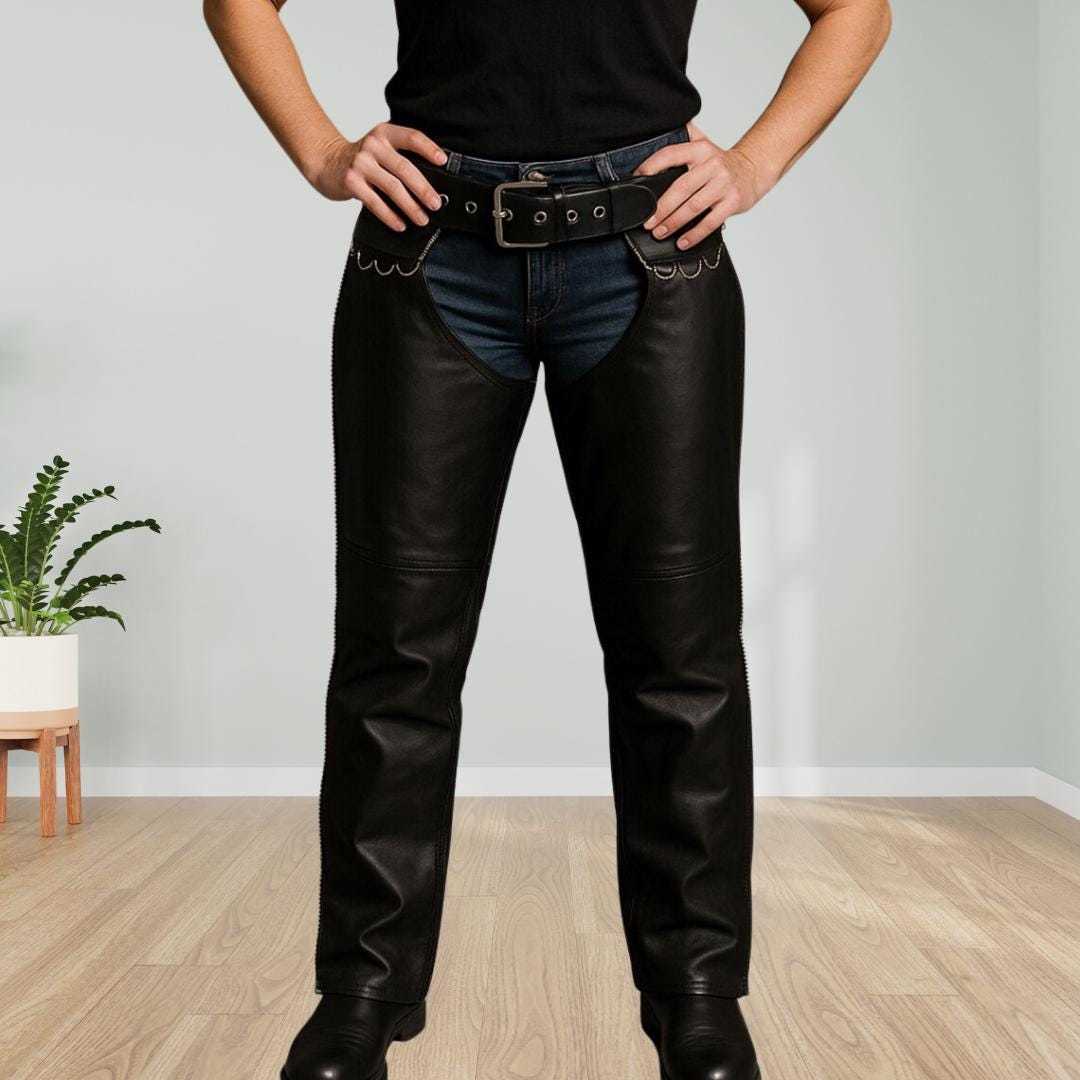 Handmade Women’s Leather Riding Chaps – High-Waisted Western Cowgirl Pants – Bik