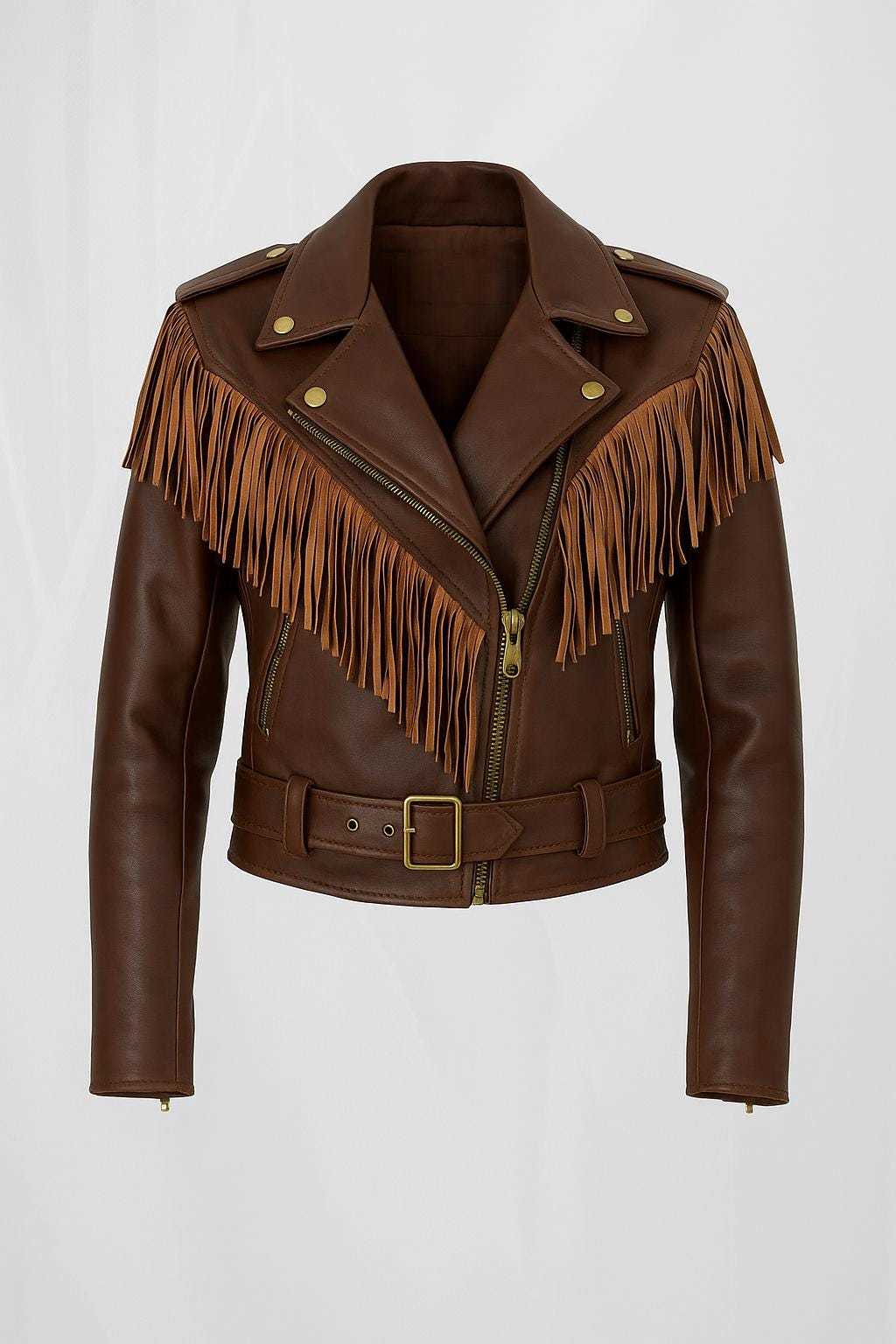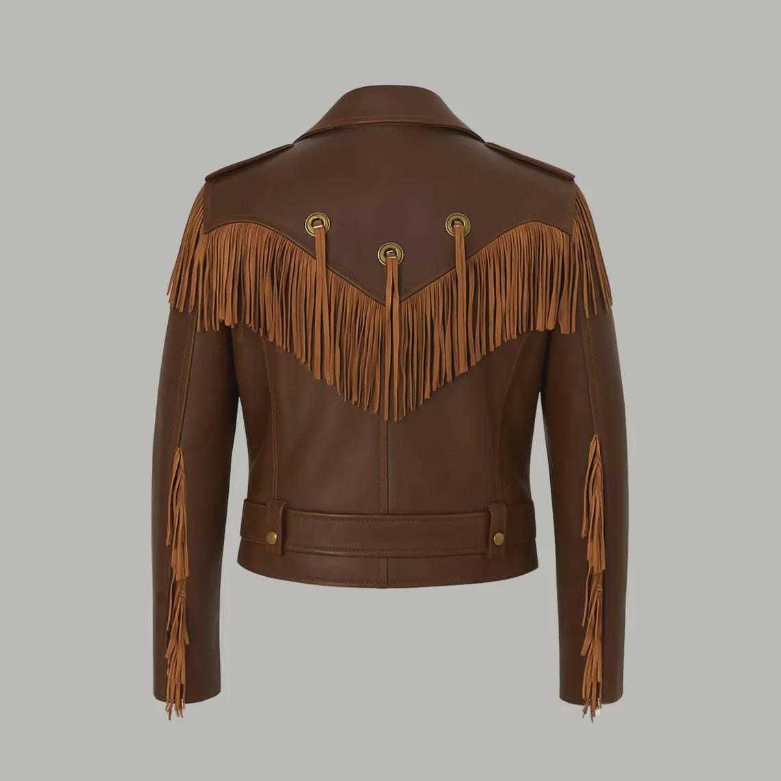 Women's Brown Leather Fringe Jacket: Vintage Western Biker Style