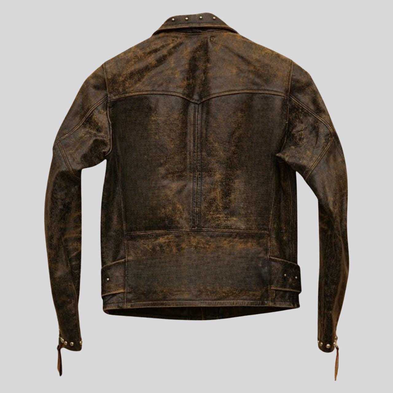 Vintage Brown Studded Leather Biker Jacket – Distressed Motorcycle Style with Be