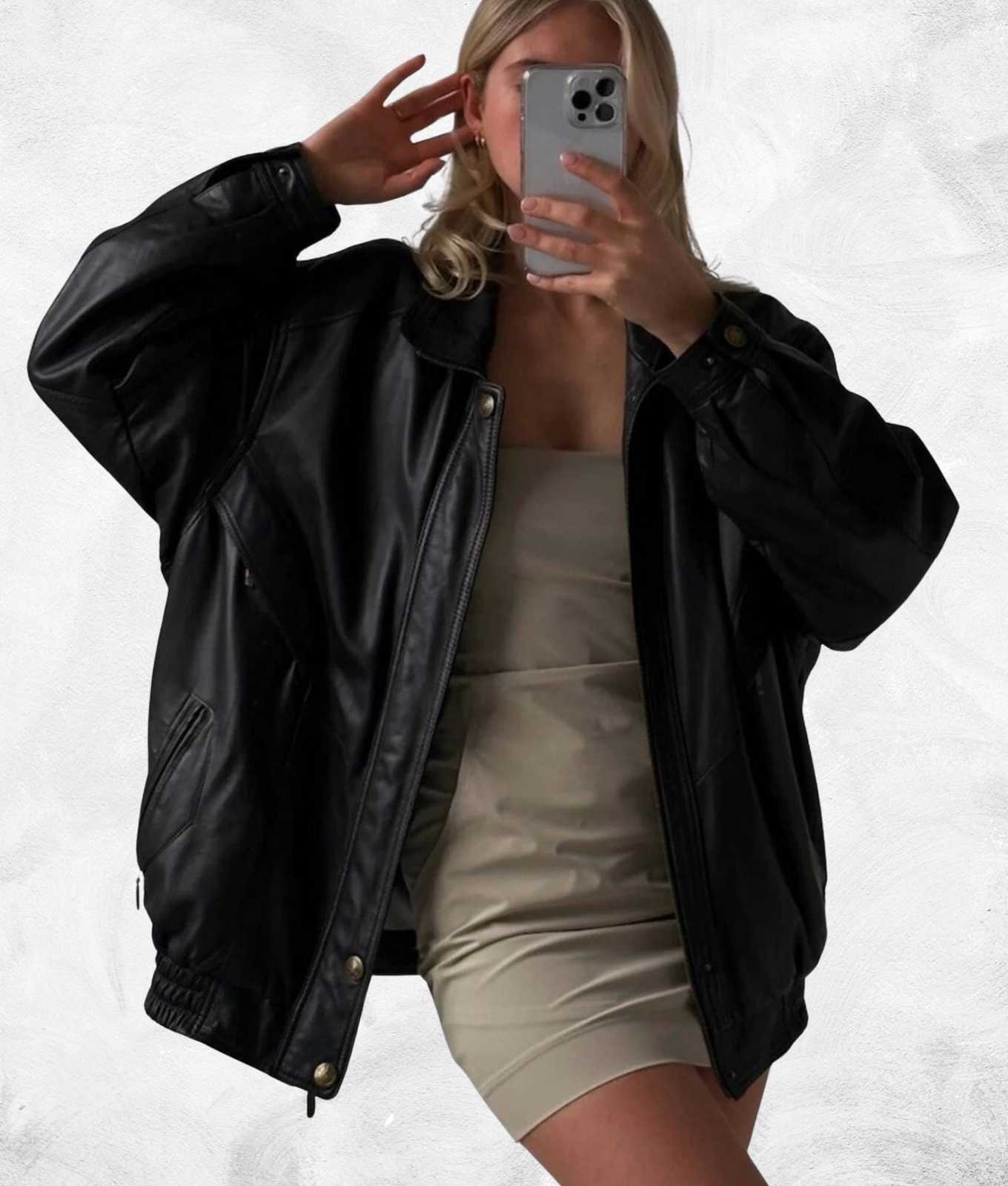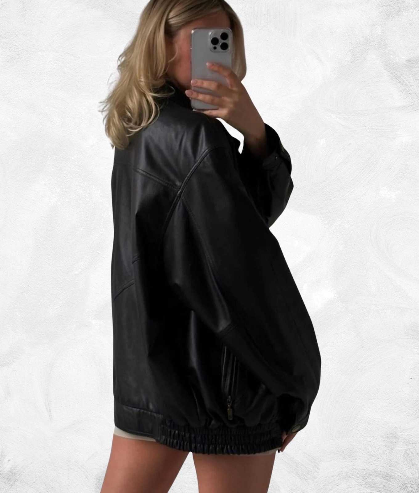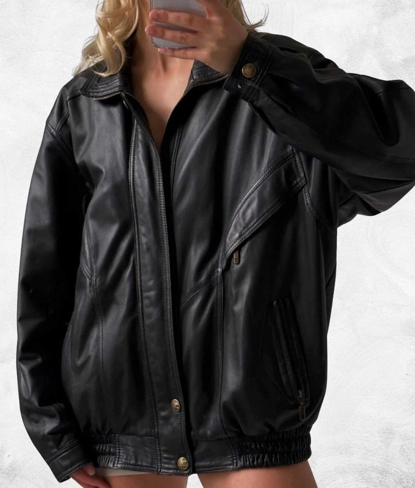 Oversized Black Leather Bomber Jacket: 90s Vintage Biker Style