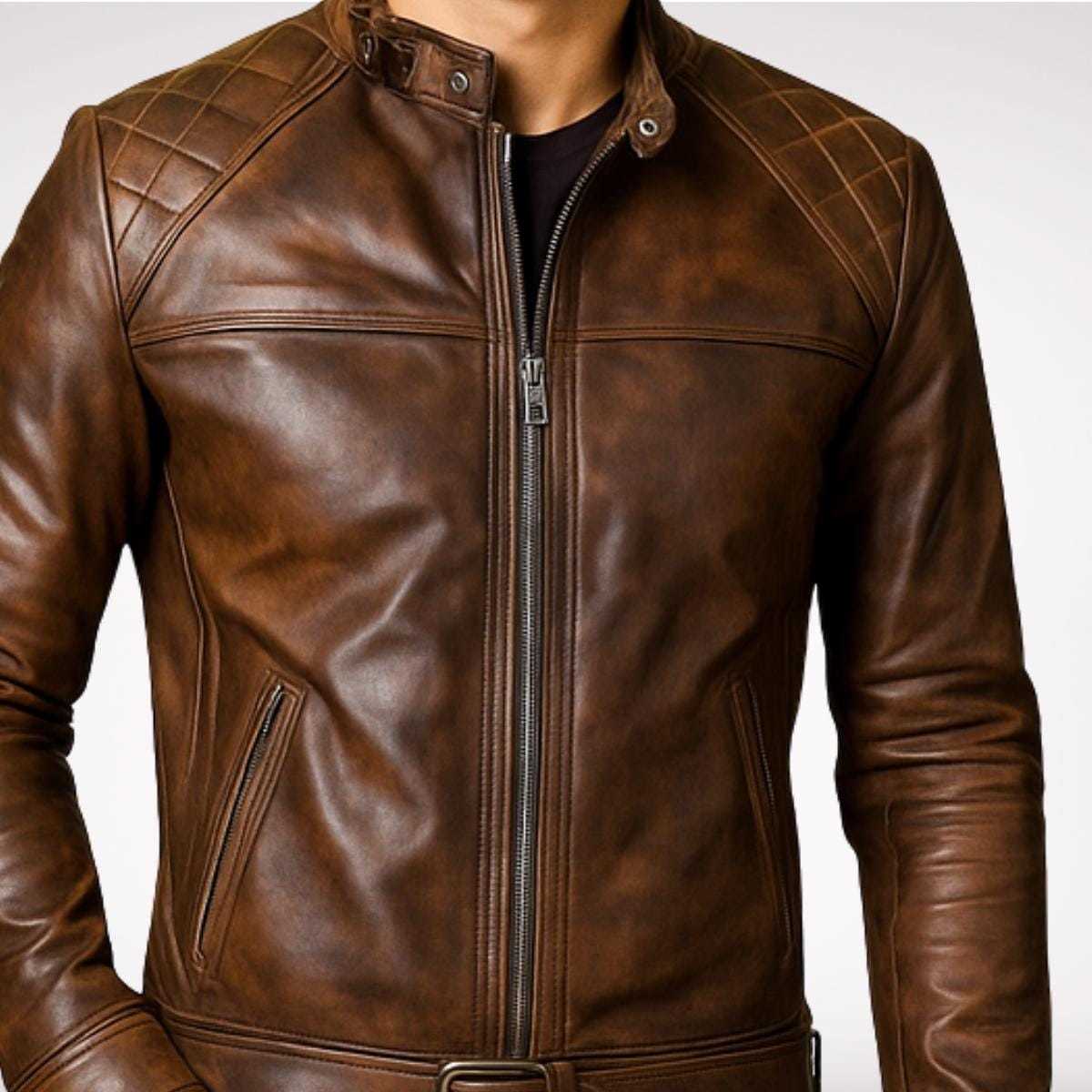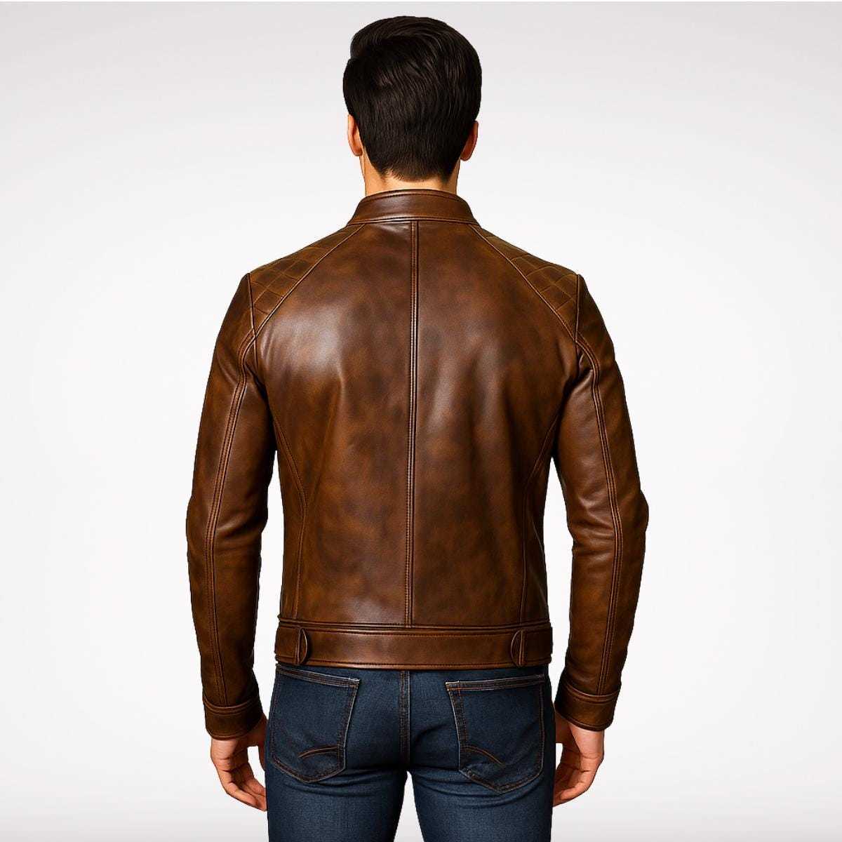 Real Leather Biker Jacket: Brown Quilted Fitted Motorcycle Coat