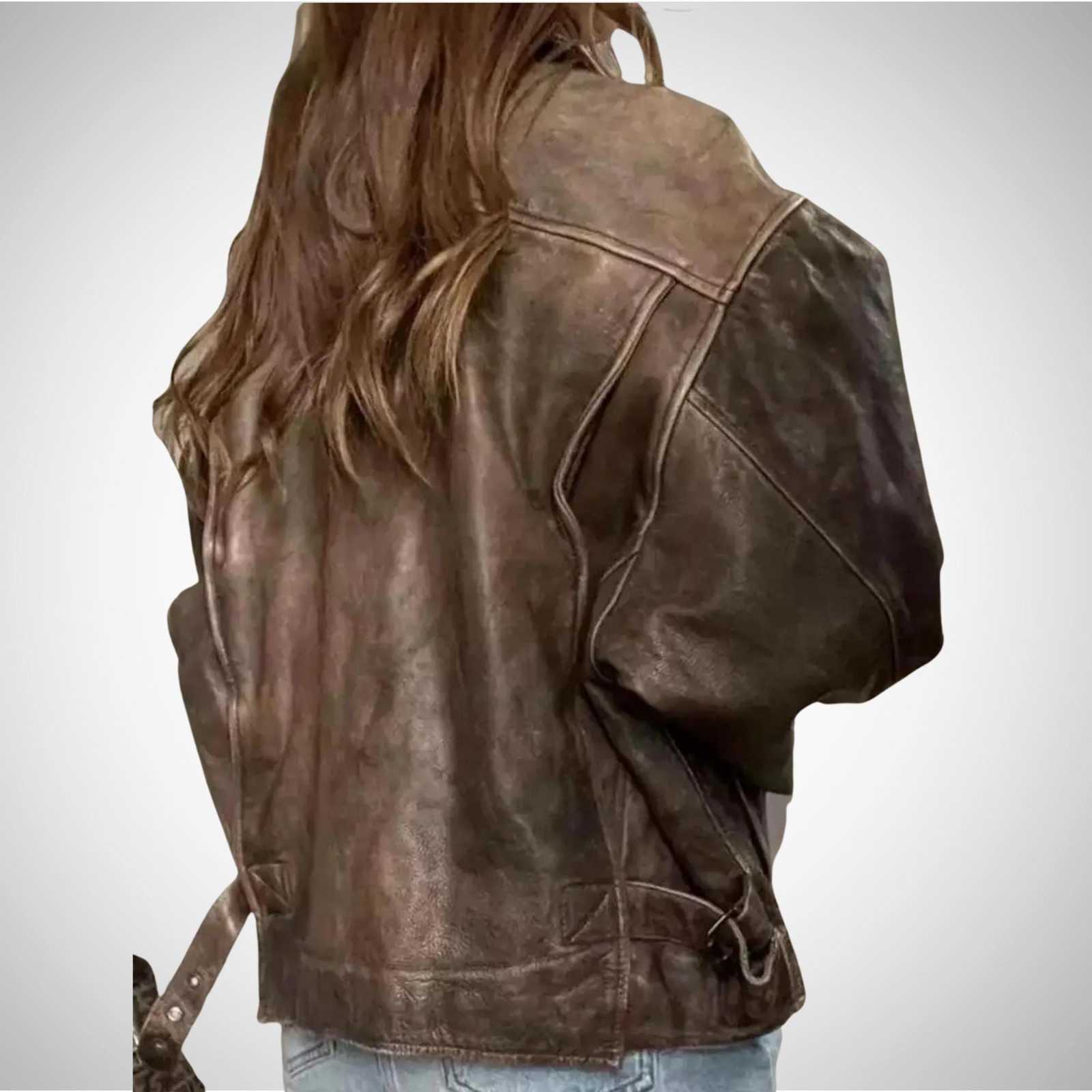 Step into timeless style with this vintage distressed leather jacket, crafted from genuine cowhide for durability and character. Featuring an oversized fit, classic collar, and retro pocket details, this jacket blends rugged charm with effortless streetwear vibes.