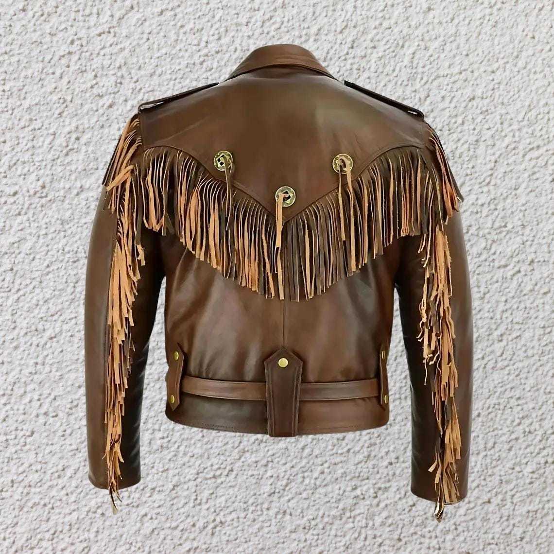 This handmade men’s distressed leather fringe jacket blends rugged biker style with classic cowboy charm. Crafted from 100% genuine cowhide leather, it features a worn-in, vintage look and fringe tassel detailing across the chest, back, and sleeves—making a bold statement wherever you go.
