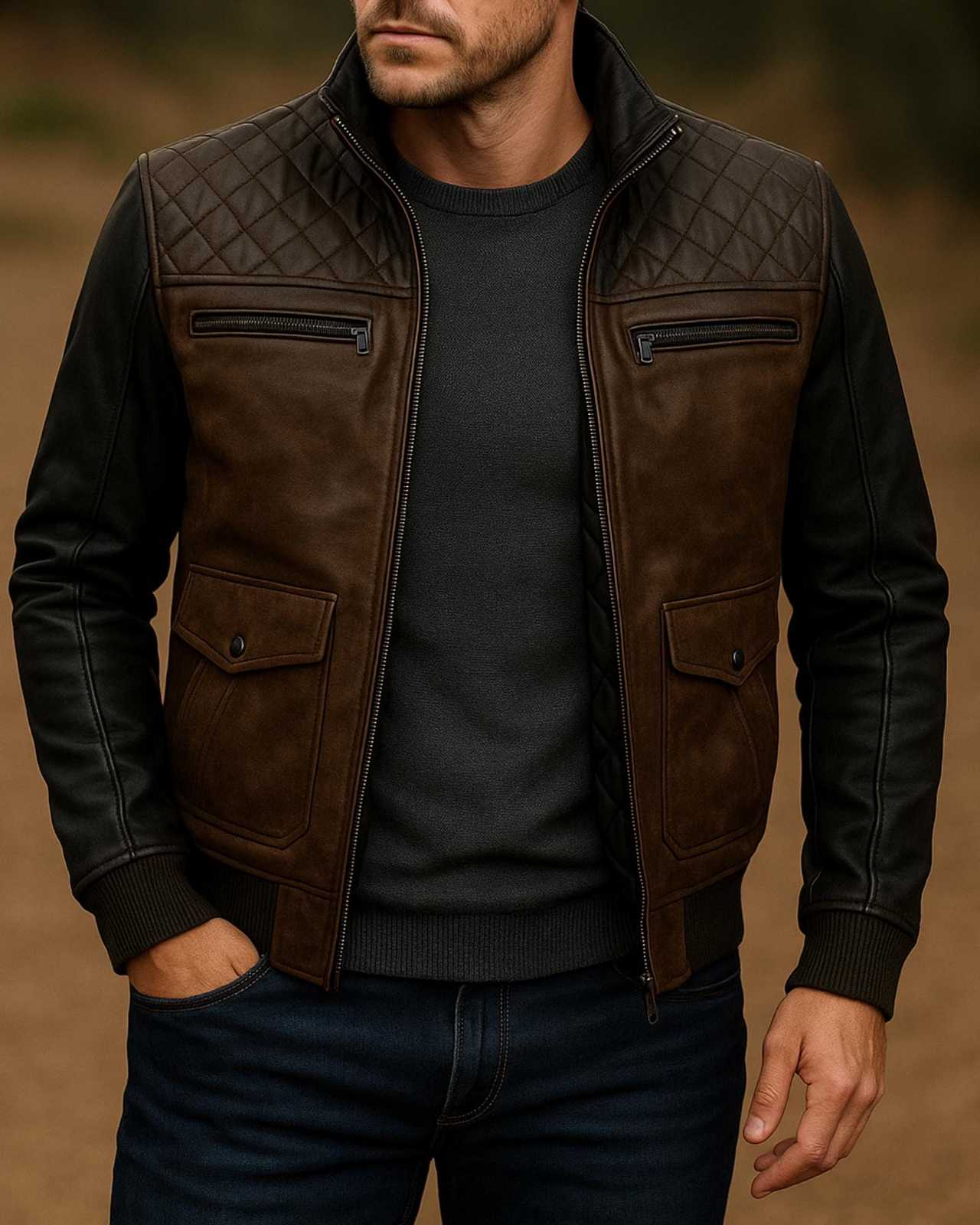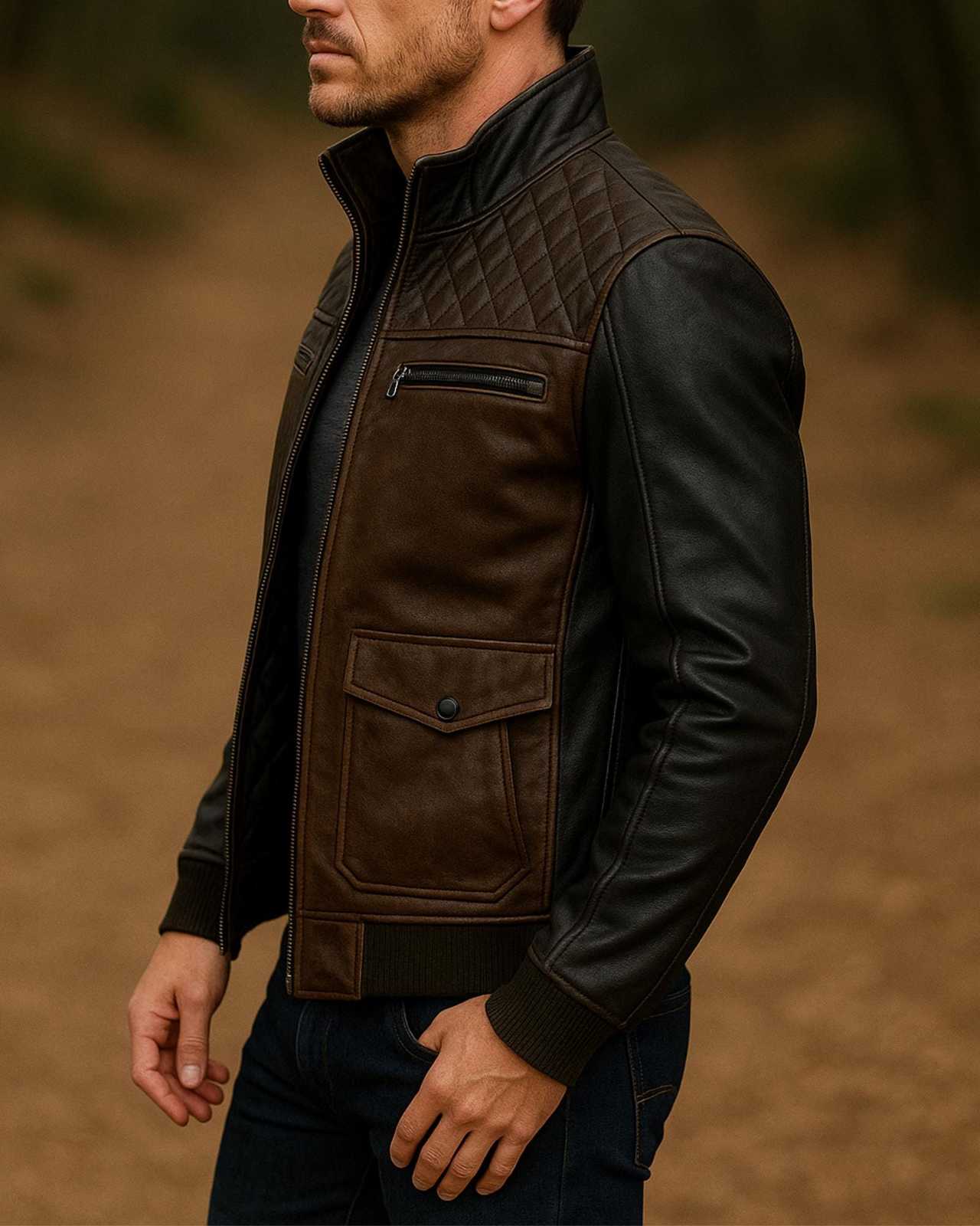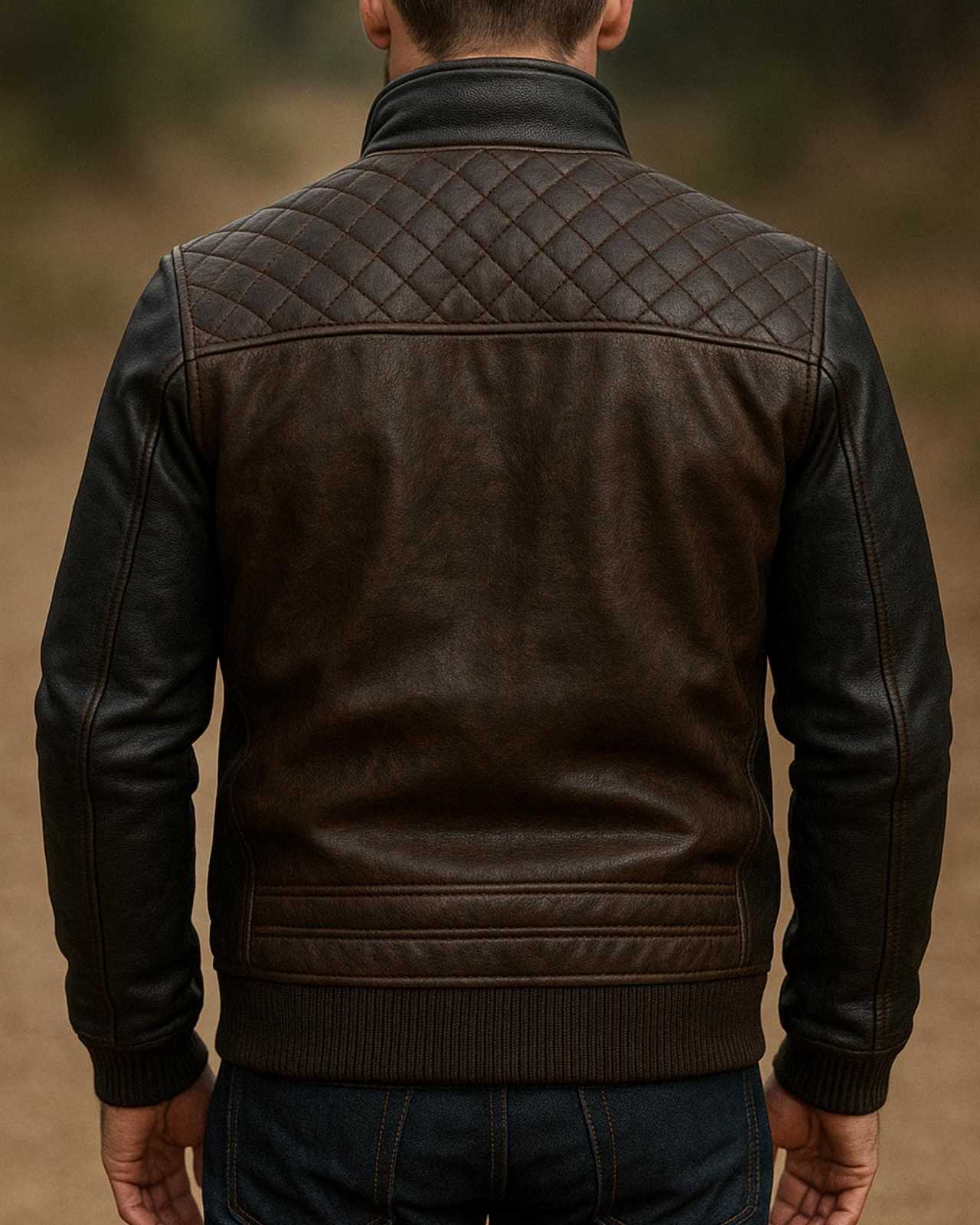 Two-Tone Cowhide Leather Bomber Jacket: Rugged Quilted Outdoor Coat