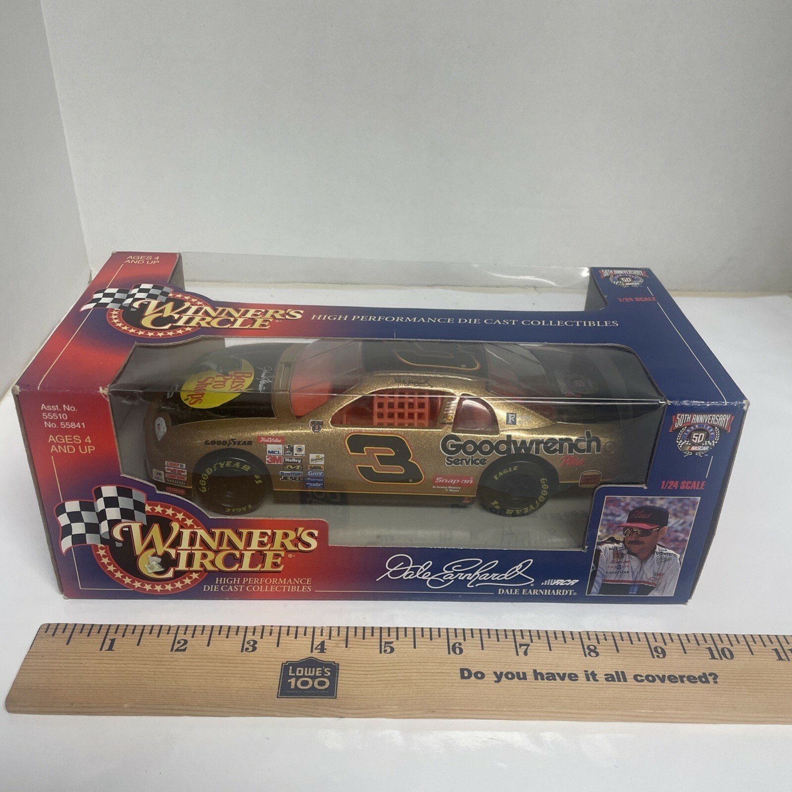 The product is a 1:24 scale diecast model of a 1998 Chevrolet Monte Carlo car driven by Dale Earnhardt Sr in the Nascar racing series. This limited edition model features a gold color scheme with branding from Bass Pro Shops and the Winner's Circle. It comes in an unopened box, making it a sought-after collectible for fans of Nascar and Dale Earnhardt Sr. The car is a replica of the vehicle driven in the 50th anniversary season of Nascar, adding to its historical significance in the world of racing.