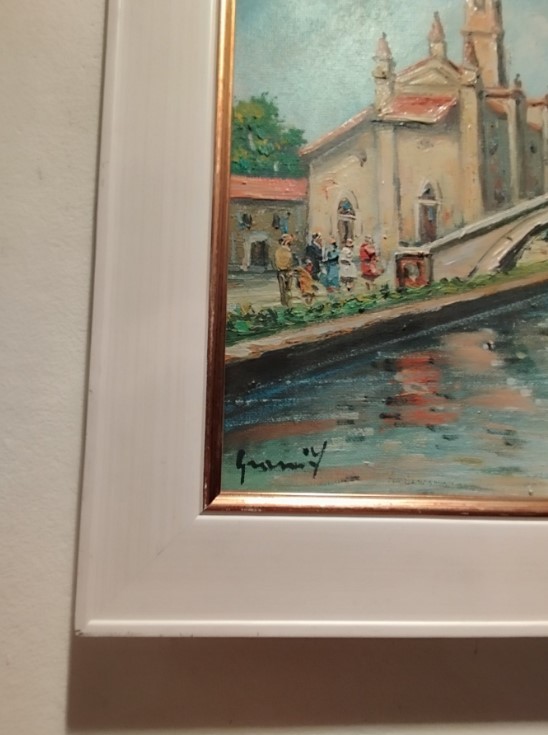 Acquire a unique oil painting by Italian artist Francesco Grassi (b.1940). Titled and hand-signed on the back, this work “Milano San Cristoforo” captures a quintessential Milanese scene with delicate brushwork and timeless charm.