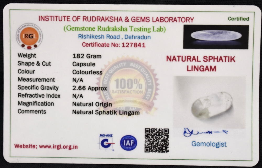 Sphatik Shivlingam - 182 gms - Lab Certified