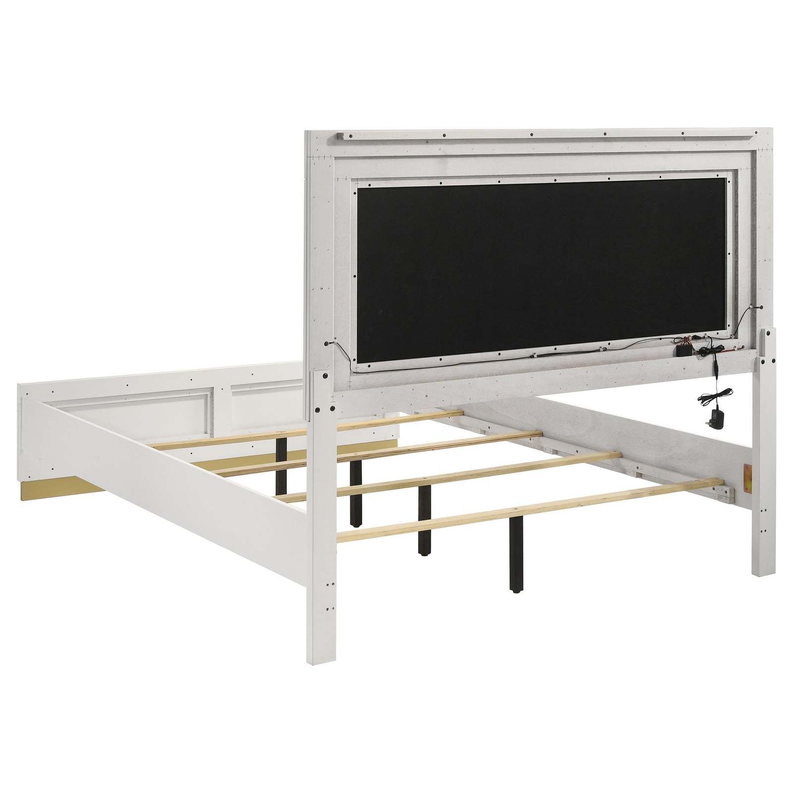 Bedroom set features a sleek panel bed with a slatted headboard, creating a modern focal point for any room