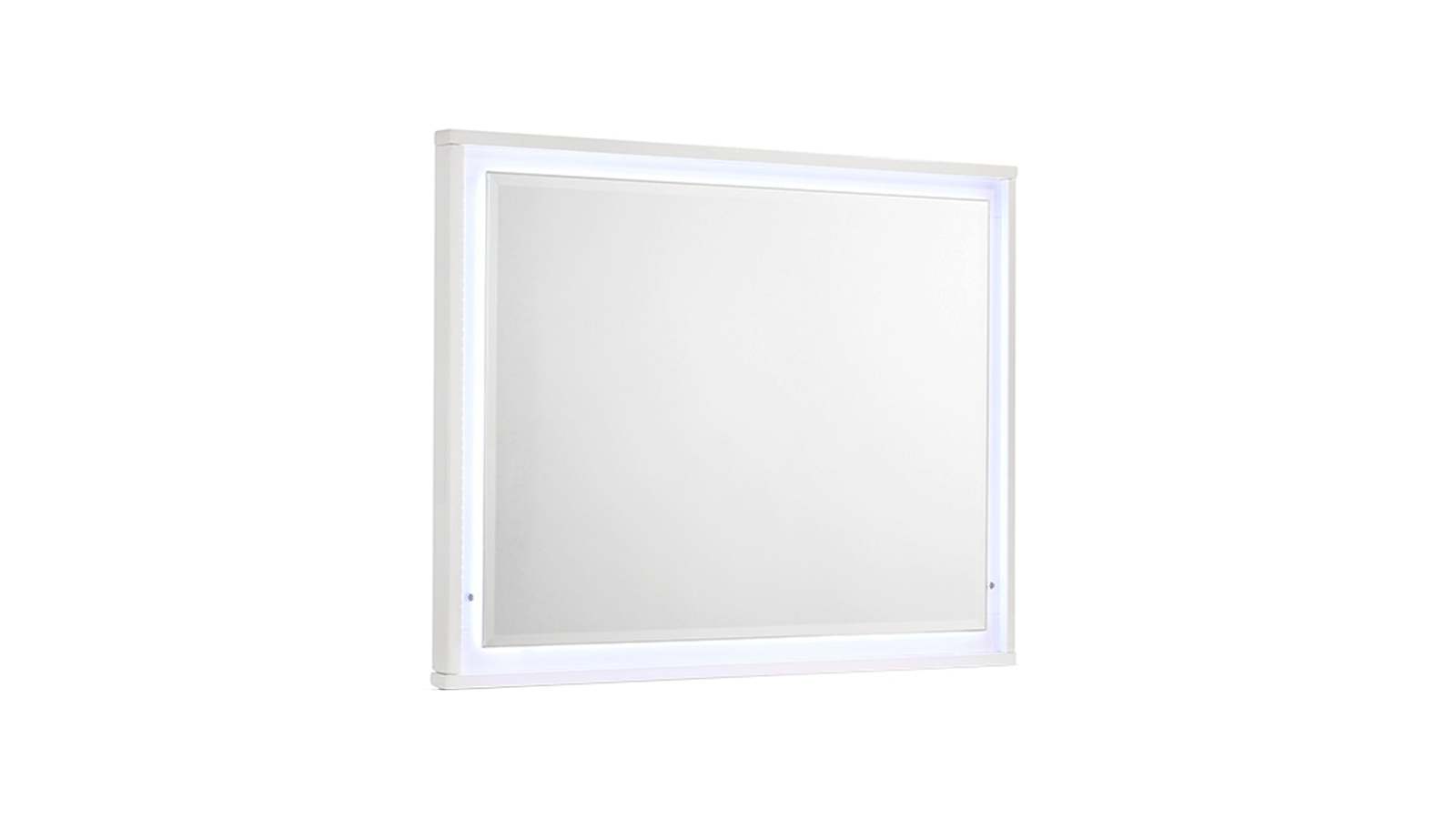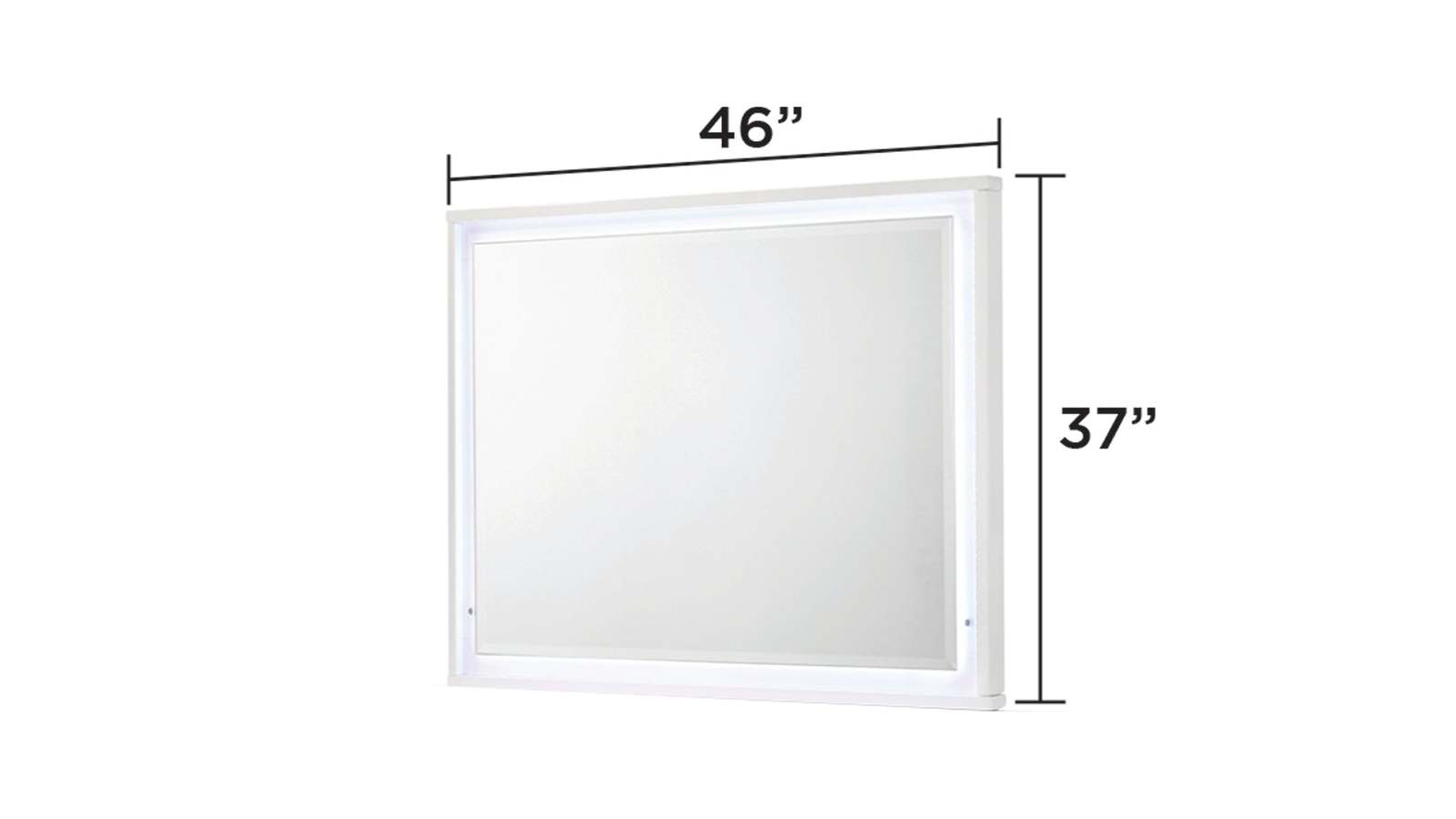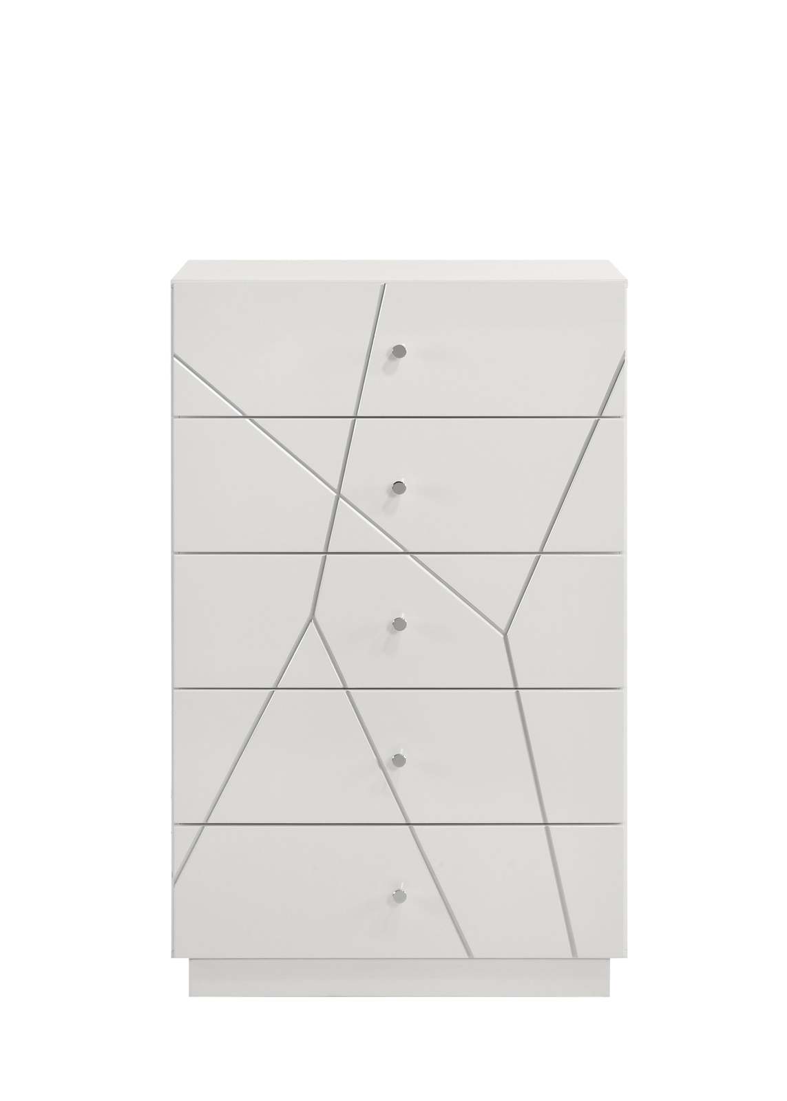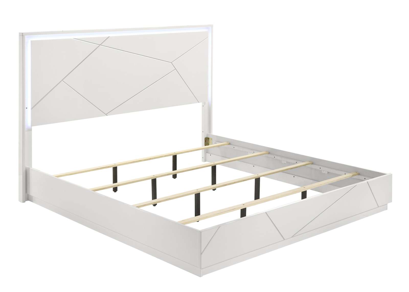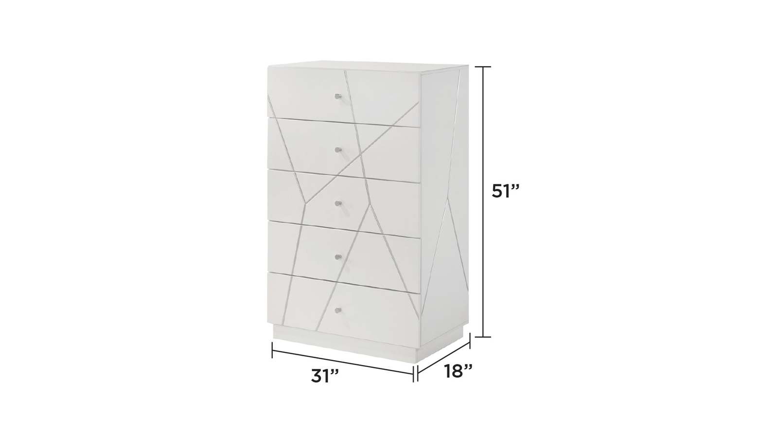 Add an element of freshness to your sleeping space with a five-piece bedroom set. Beachy vibes are found with a coastal white exterior on the nightstand, dresser, mirror, chest and platform bed featuring a plank style headboard.