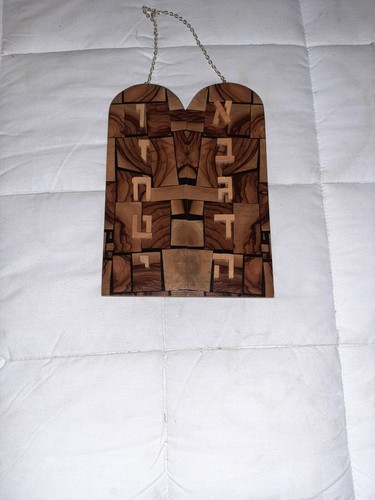 Vintage Judaica Hebrew 10 Commandments Olive Wood Plaque Judaism Bethlehem. This measures approximately 7.4 inches tall and 5.5 inches wide. There is an attached chain to hang it by