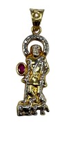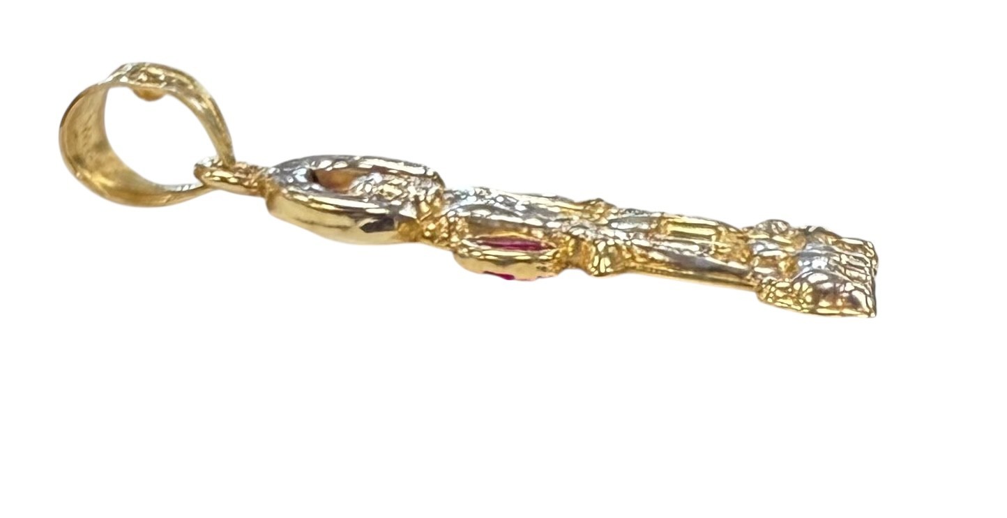 Type: CharmWeight: .8Karat: 10ktMetal: Yellow and White GoldGender: UnisexStyle: ReligiousSize / Length: 1"Owner applied: 10KStone 1 quantity: 1Stone 1 shape: RoundStone 1 color: RedStone 2 Quantity: 1Stone 2 Shape: RoundStone 2 Color: ClearStone 1 weight (total): .02Stone 1 type: RubyStone 2 Weight (Total): .01Stone 2 Type: Cubic ZirconiaCondition:Used