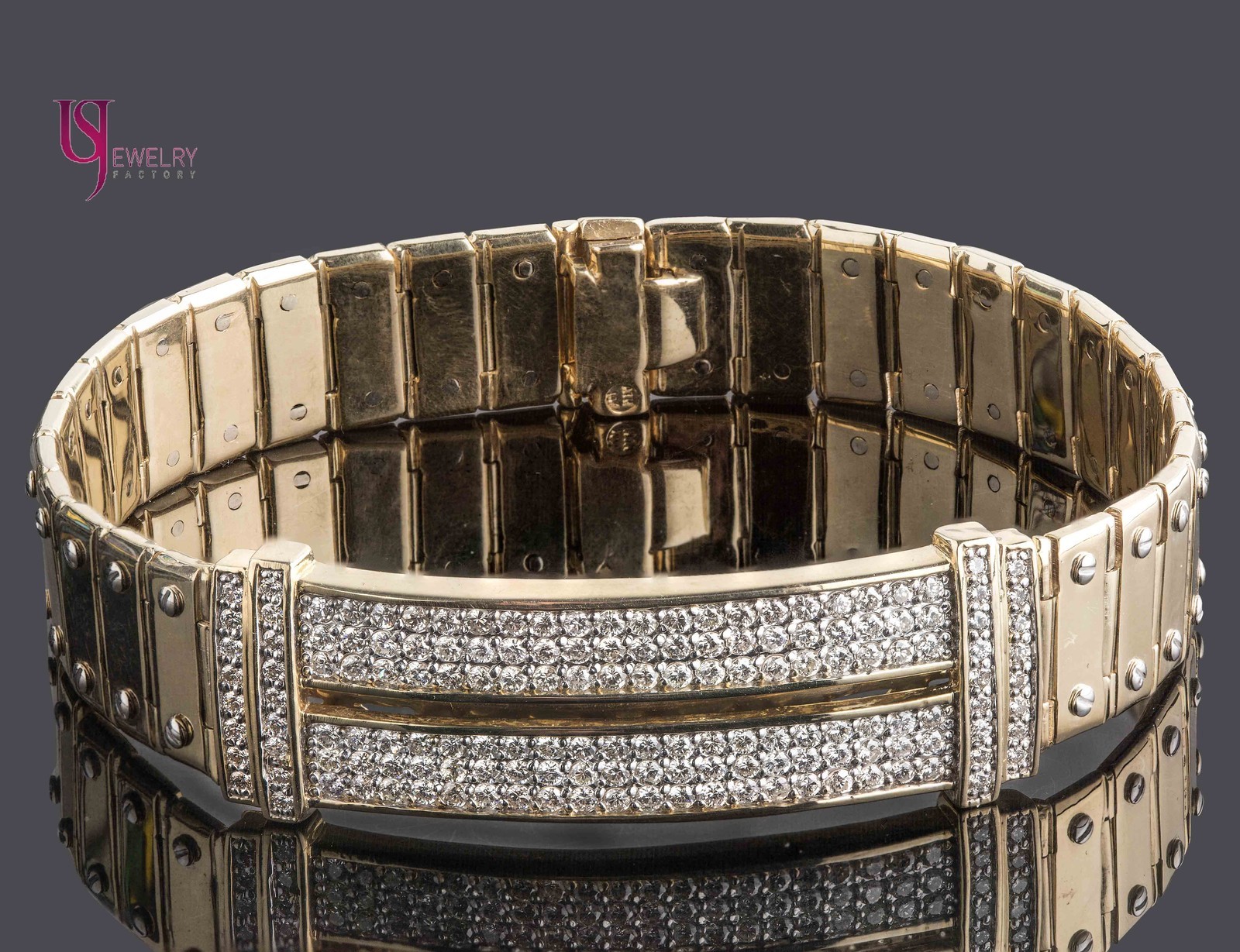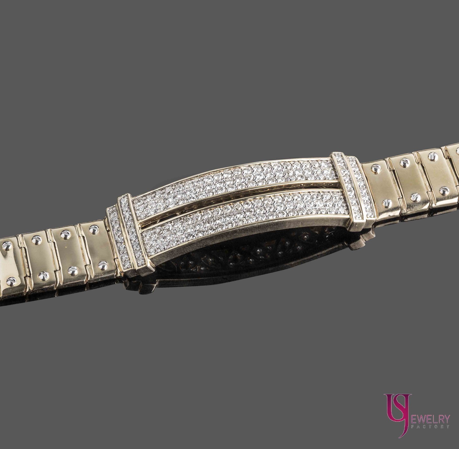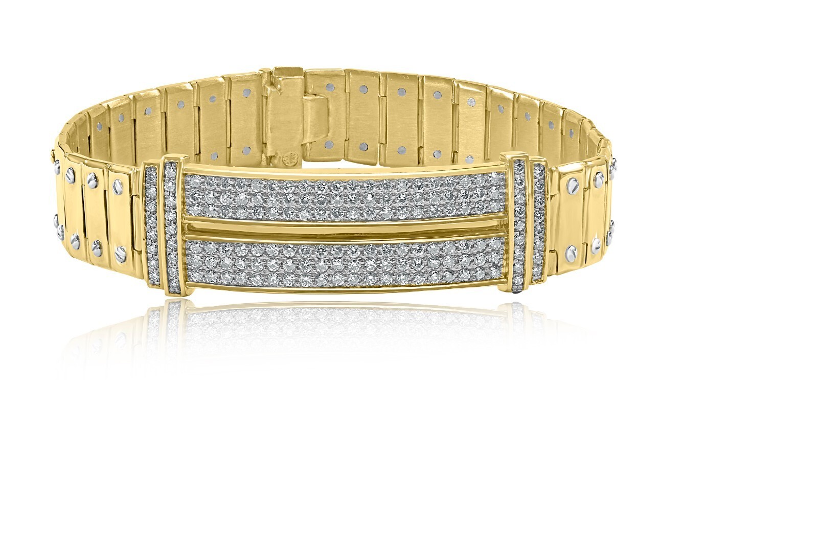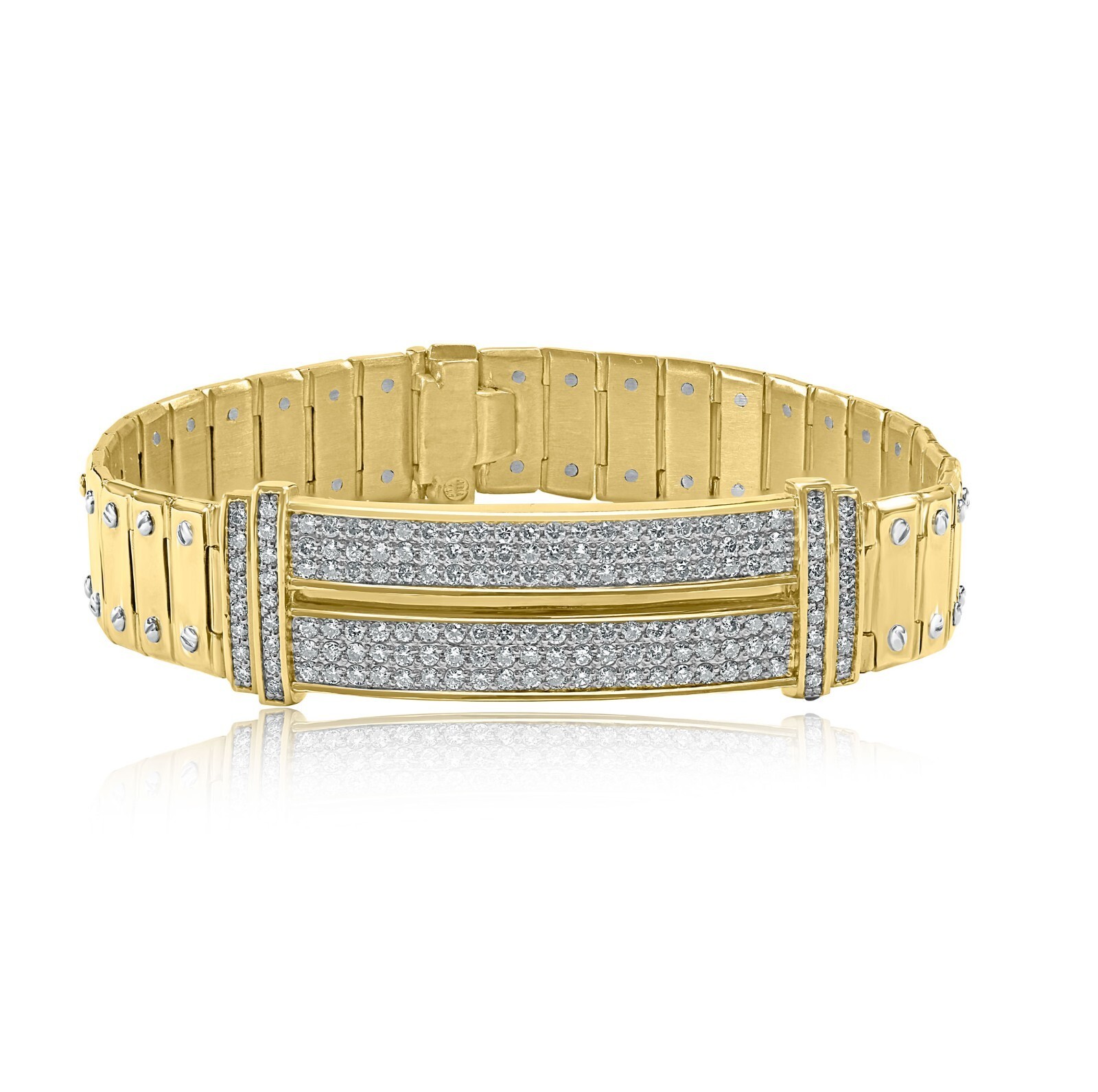 Este brazalete de hombre de identificacion artesanal perfecto se ha hecho con un ojo cuidadoso a los detalles pequeños. El brazalete esta hecho de oro amarillo solido de 14k con enlaces de detalles de tornillo y una placa dividida Eso esta incrustado con diamantes de corte redondo Pave. El brazalete mide 8 pulgadas y encierra con un bloqueo seguro de caja de seguridad y un cierre de doble seguridad plegable.
