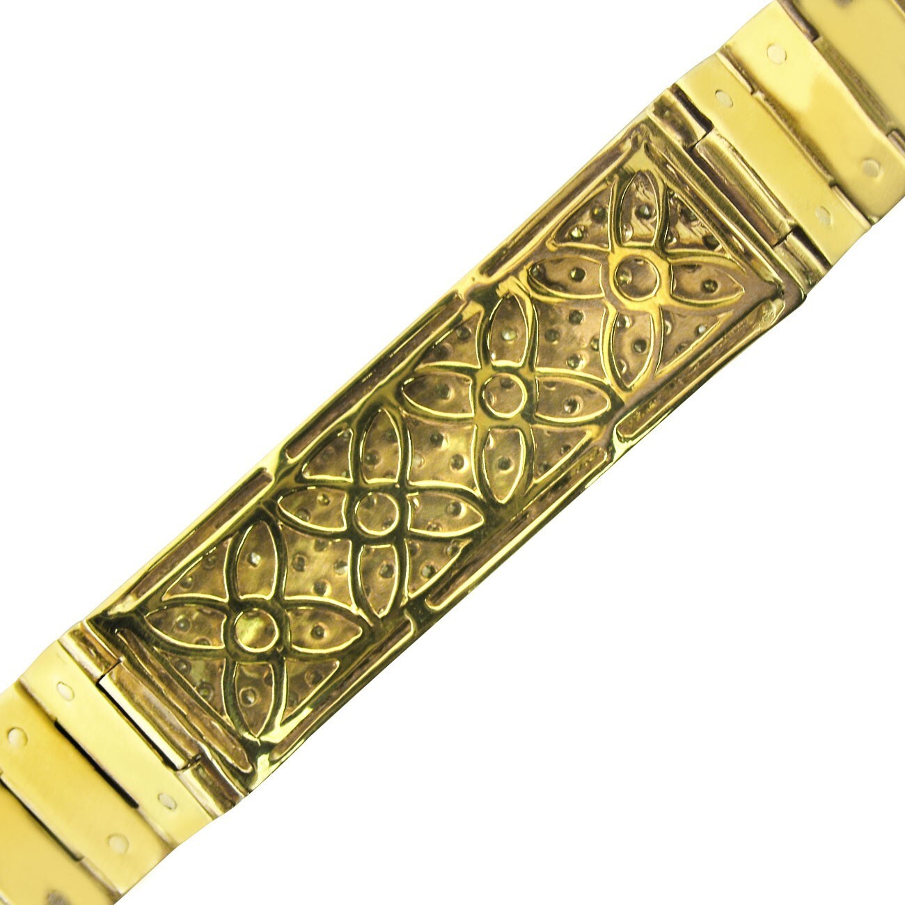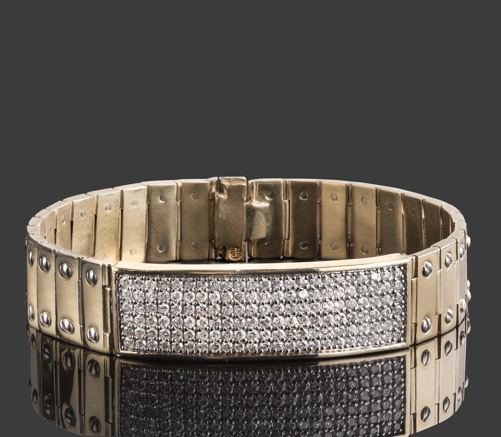 Este brazalete de hombre de identificacion artesanal perfecto se ha hecho con un ojo cuidadoso a los detalles pequeños. El brazalete esta hecho de oro amarillo solido de 14k con detalles de tornillos inspirados en Cartier y enlaces de diamantes. Utilizamos tecnicas italianas especiales de produccion de joyas, lo que resulta en un lujoso acabado de nuestras pulseras. Todas nuestras pulseras hechas en EE. UU. Vienen con una garantía limitada que protege los enlaces y los sujetos.