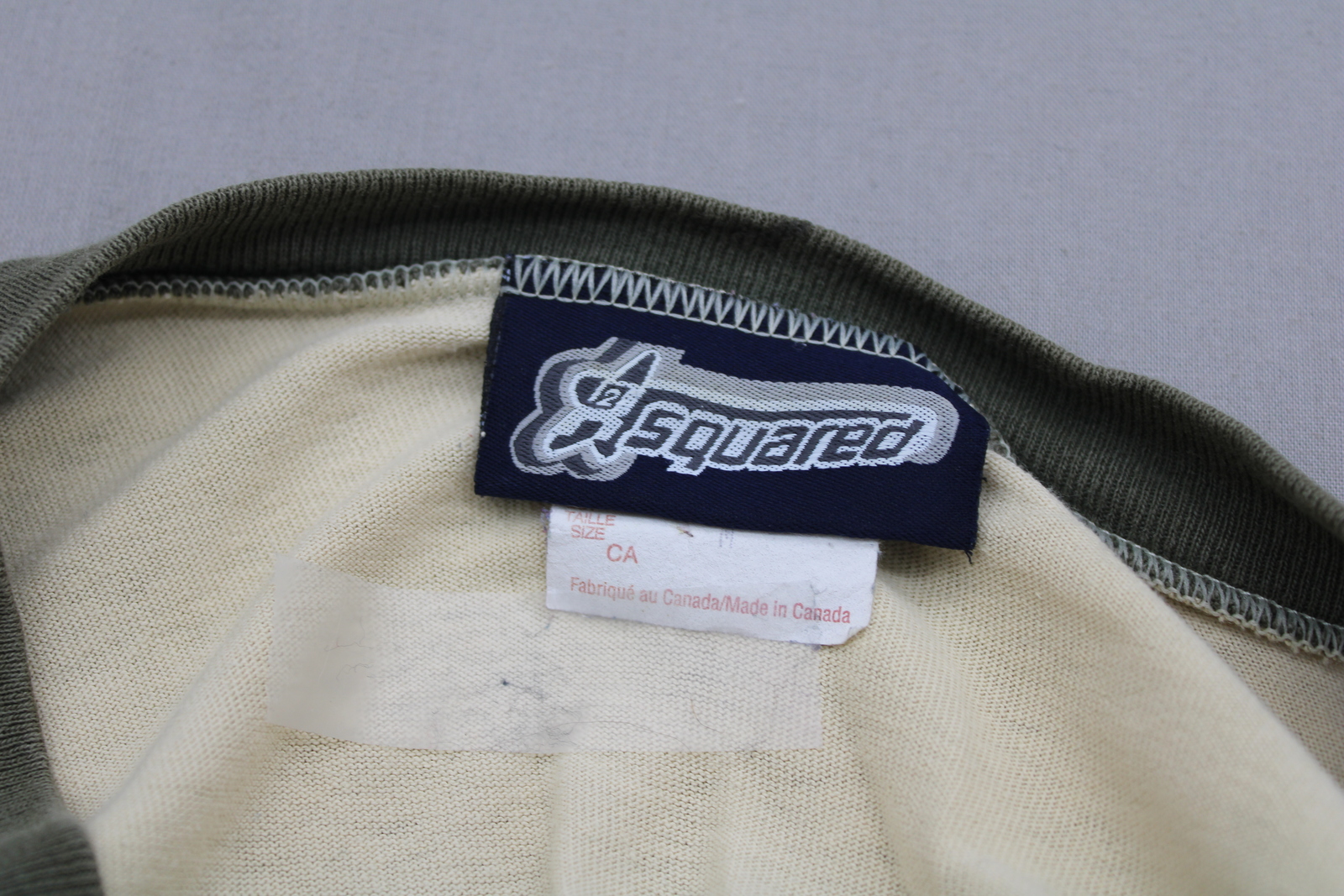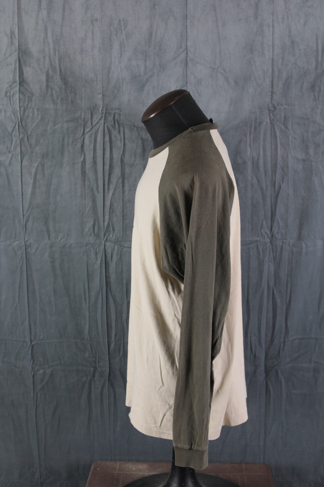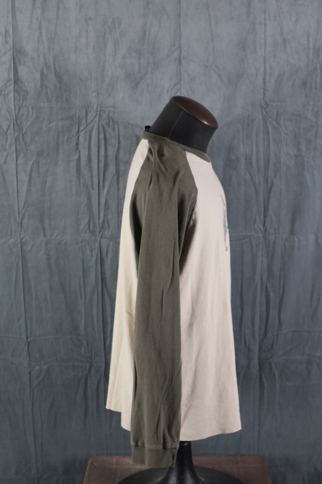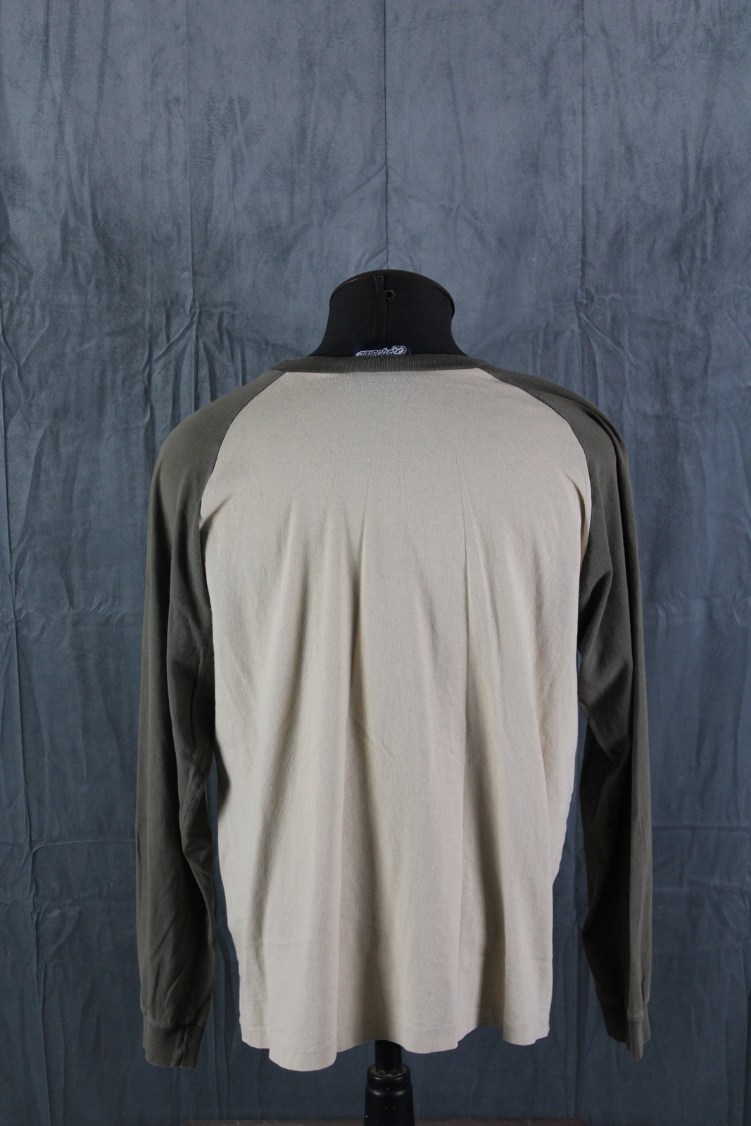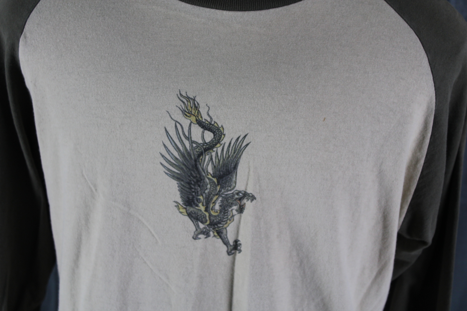 Up for sale is a vintage long-sleeve graphic t-shirt. It has a cream body with brown sleeves. The front of the shirt has a graphic of a dragon screened on. What a great shirt do not miss out on it.