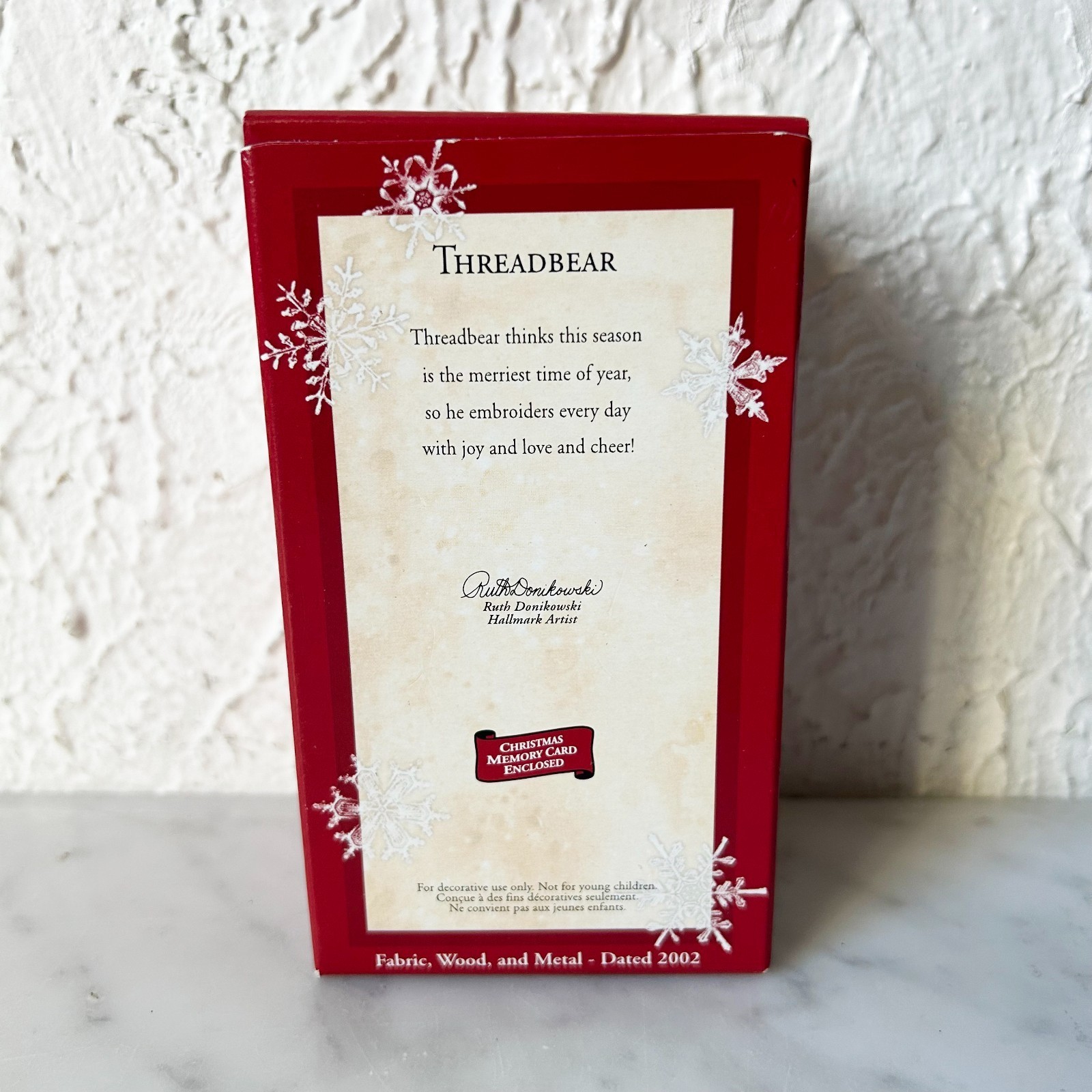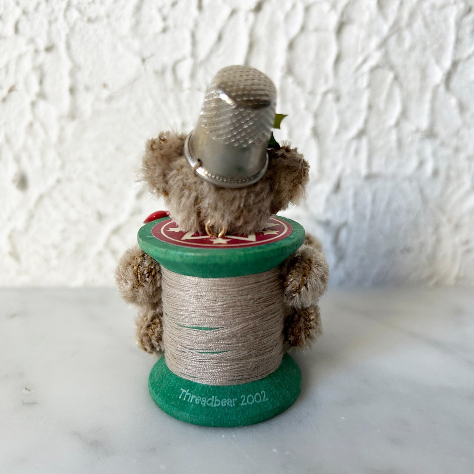 Hallmark Christmas ornament Threadbear 2002. Spool of thread Teddy Bear wears a thimble hat. In original box.