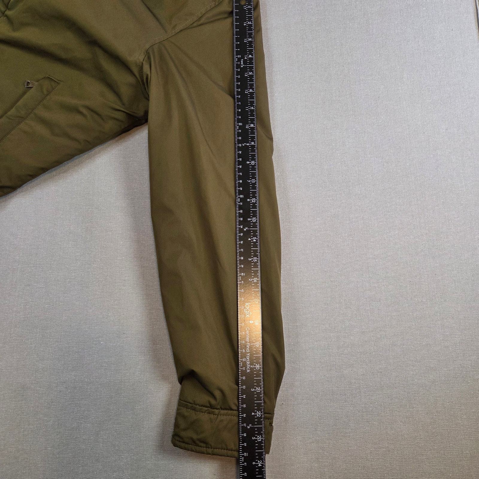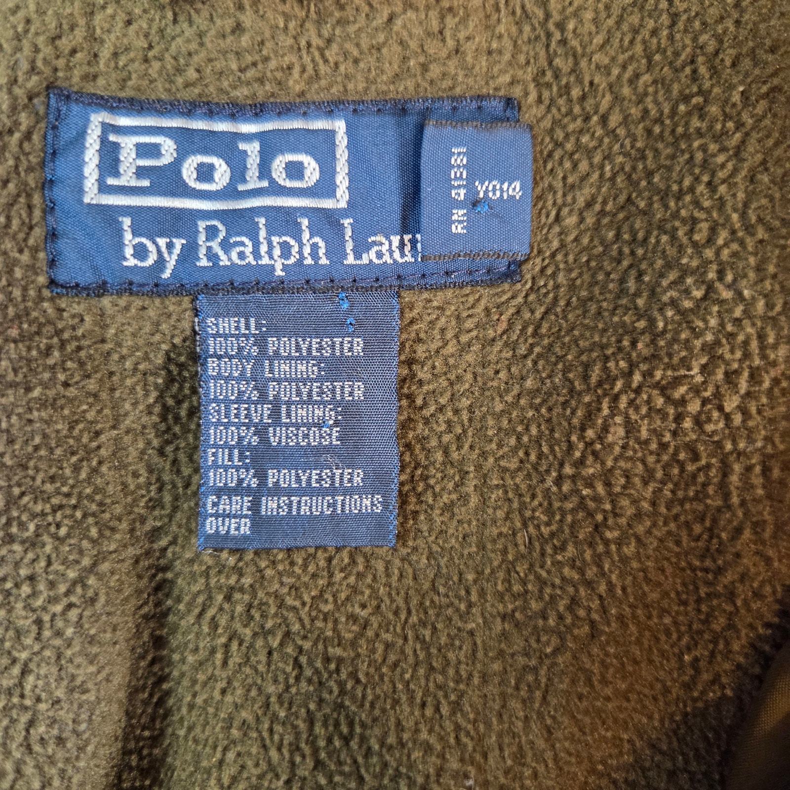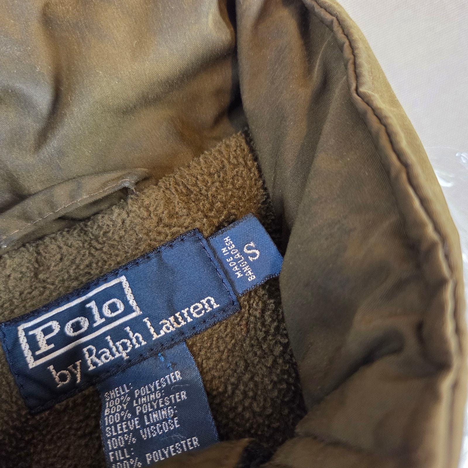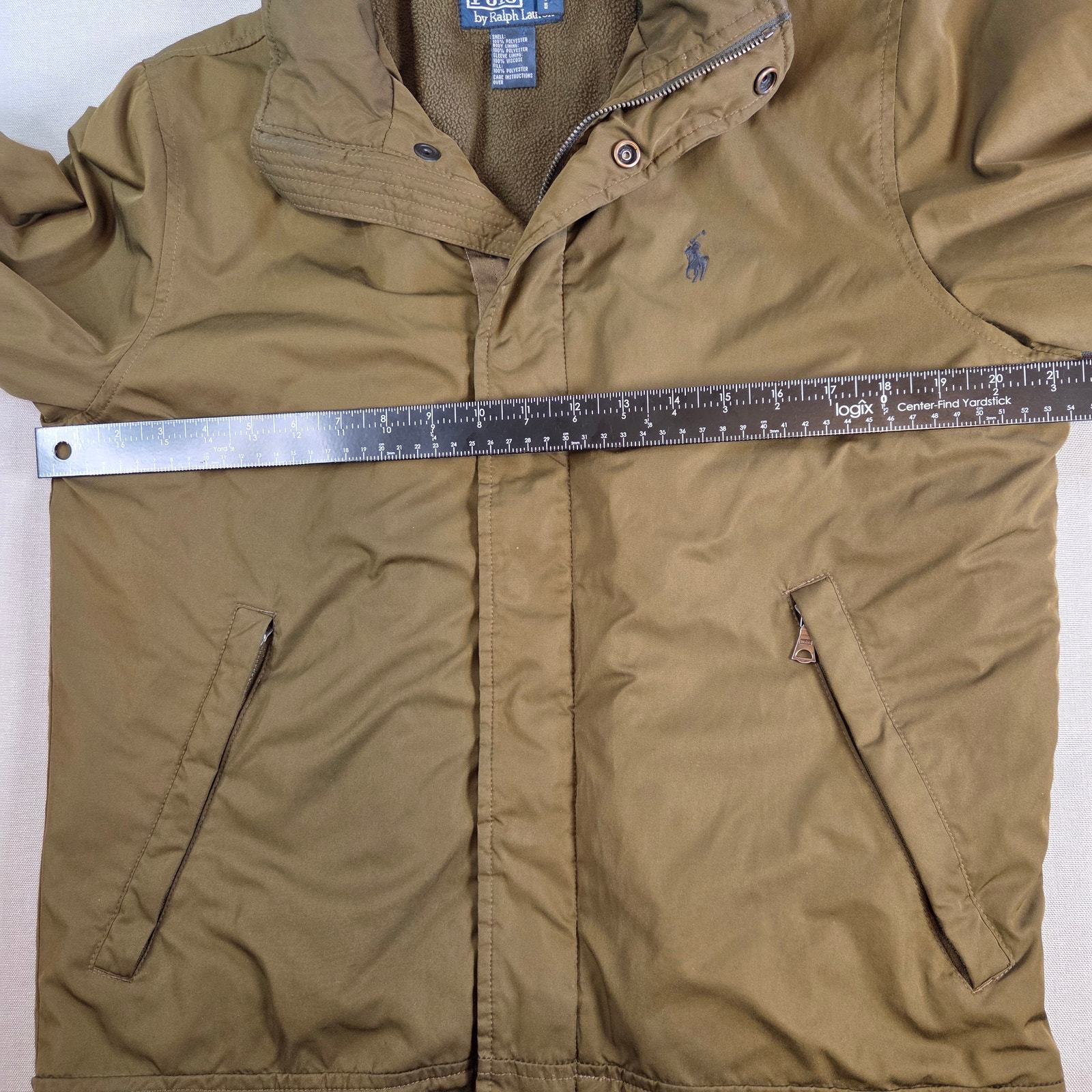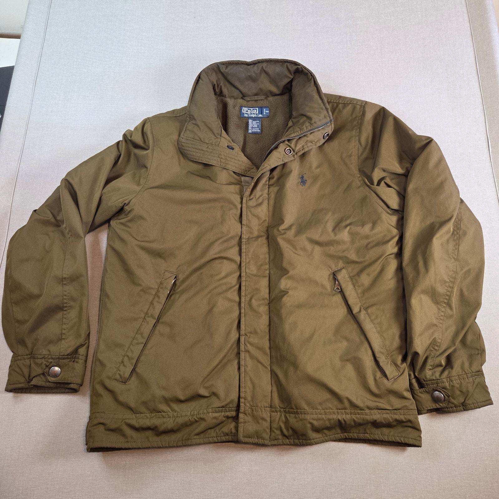 Classic Polo by Ralph Lauren men?s jacket in olive green, size Small. Features a durable polyester shell with soft fleece lining for warmth. The jacket has a full zip front with snap button storm flap, two slant zip pockets, adjustable cuffs, and hem buttons embossed ?Ralph Lauren Polo N.Y.?