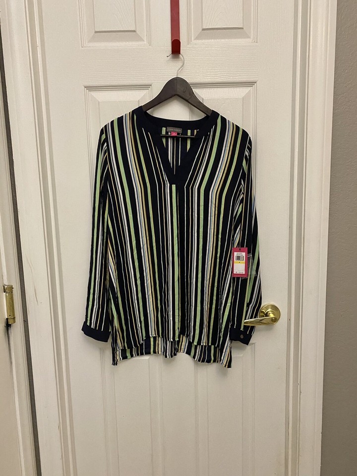 Vince Camuto Vertical Stripe Split Neck Blouse NWT New Medium Reg $89. Condition is "New with tags". Shipped with USPS First Class.