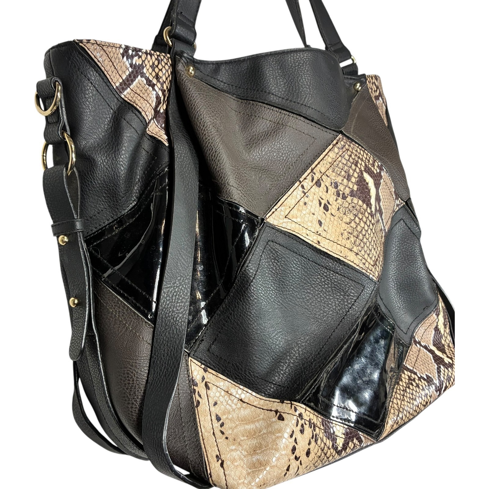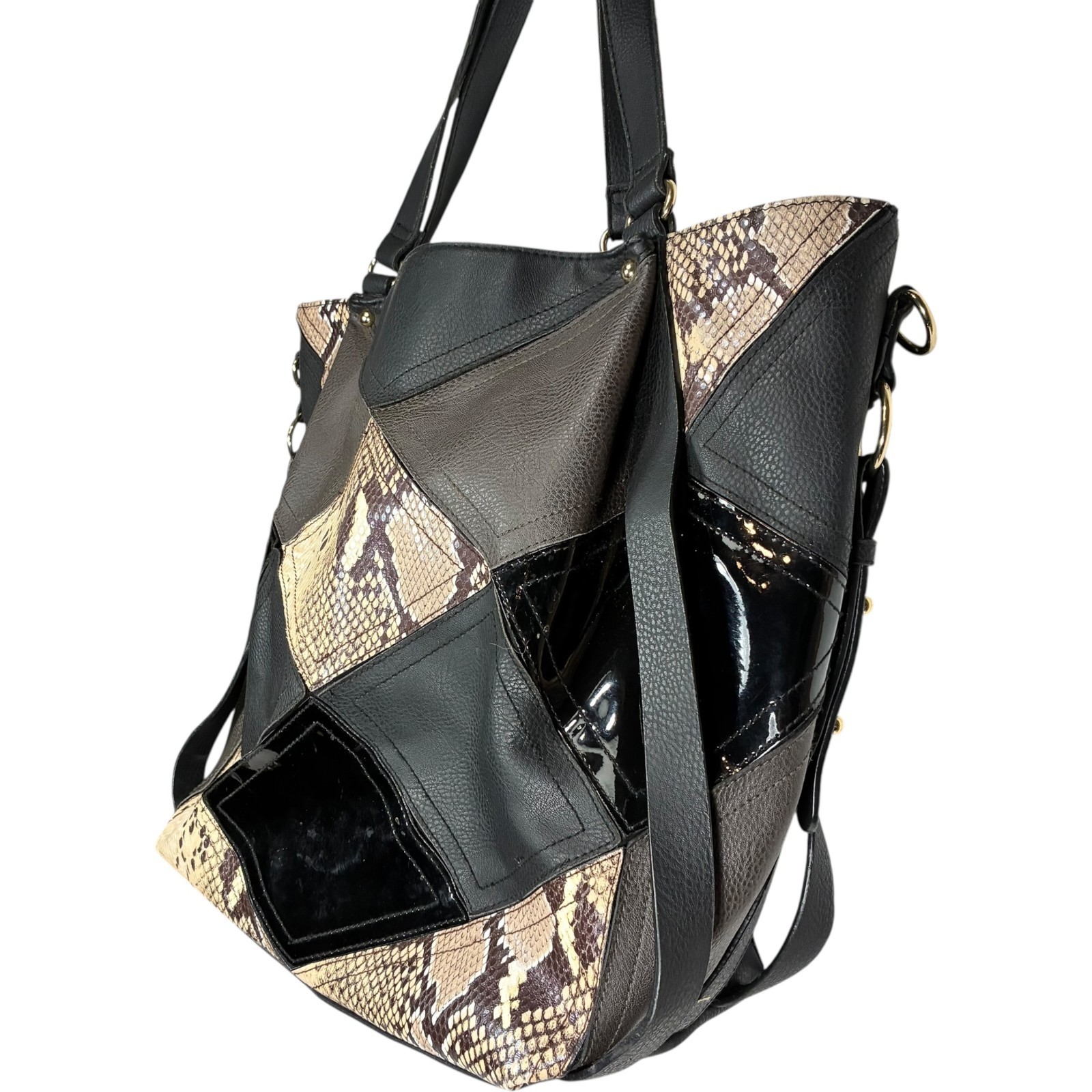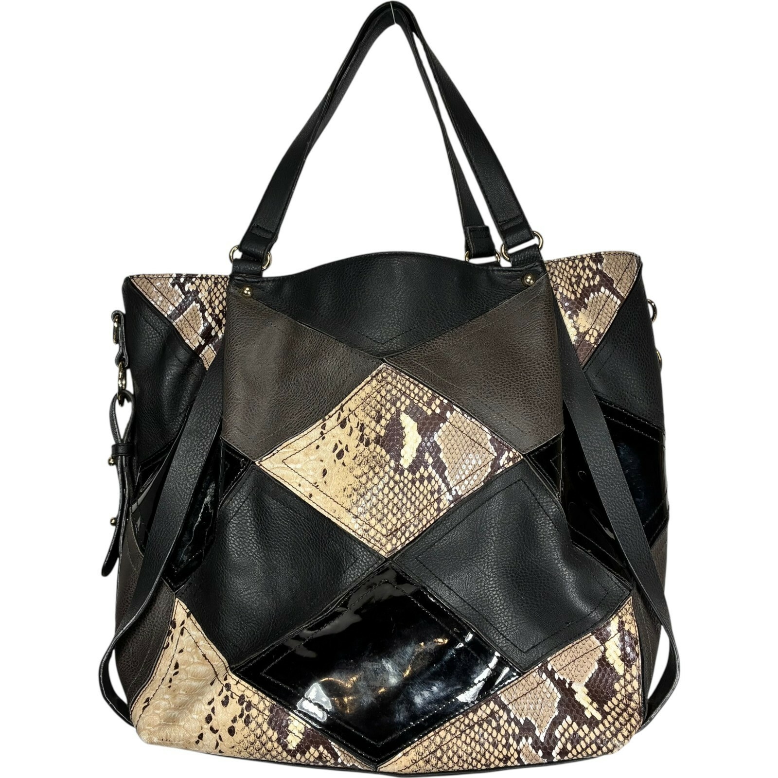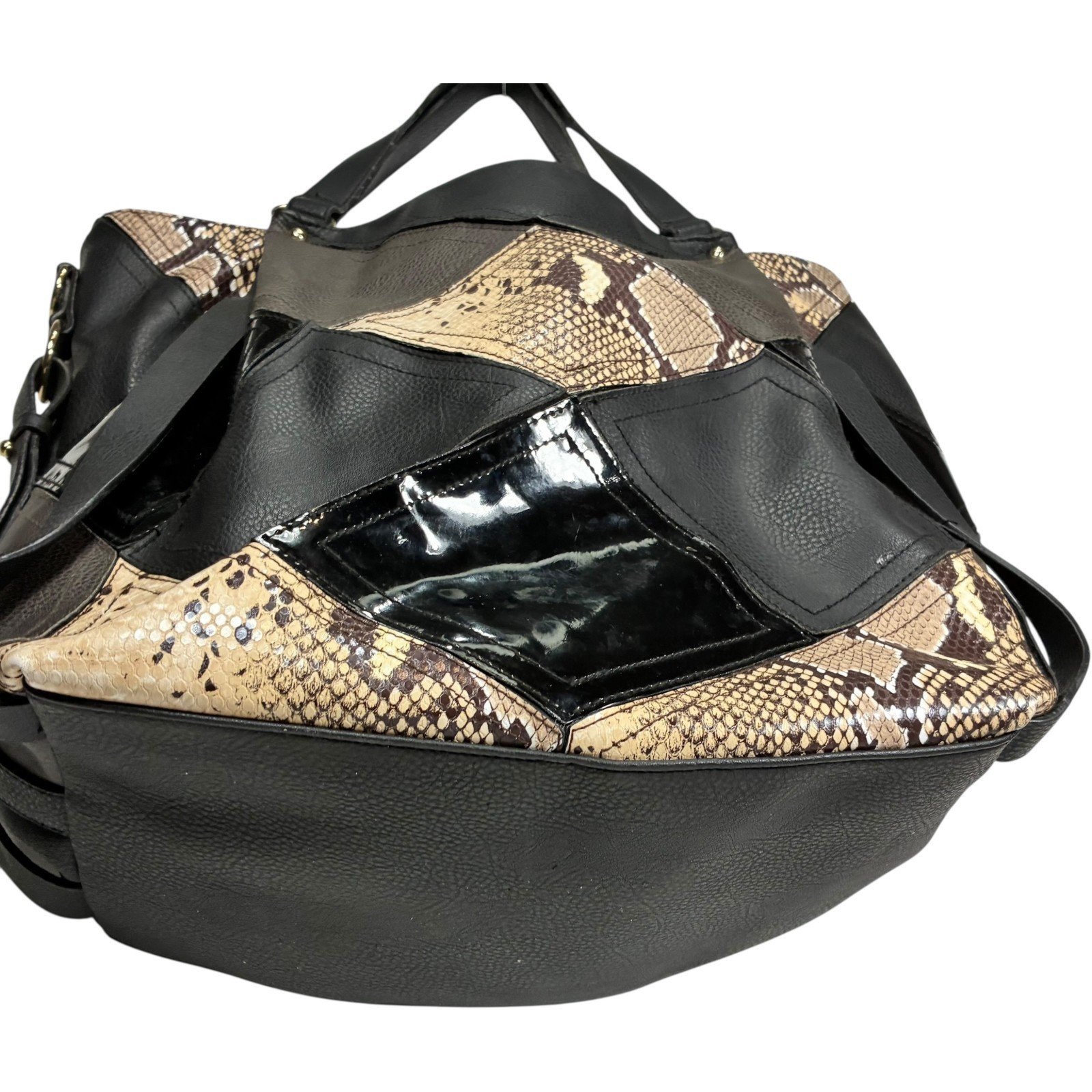 Big Buddha Patchwork Tote Faux Leather Matte Shiny Black w/Snake print 14x13x6 inches