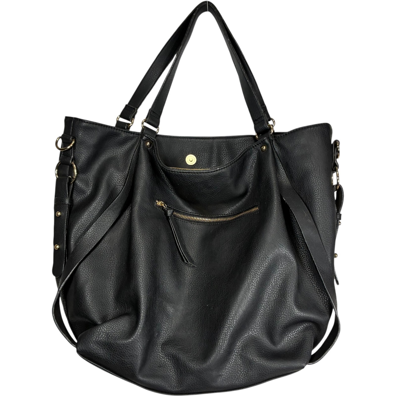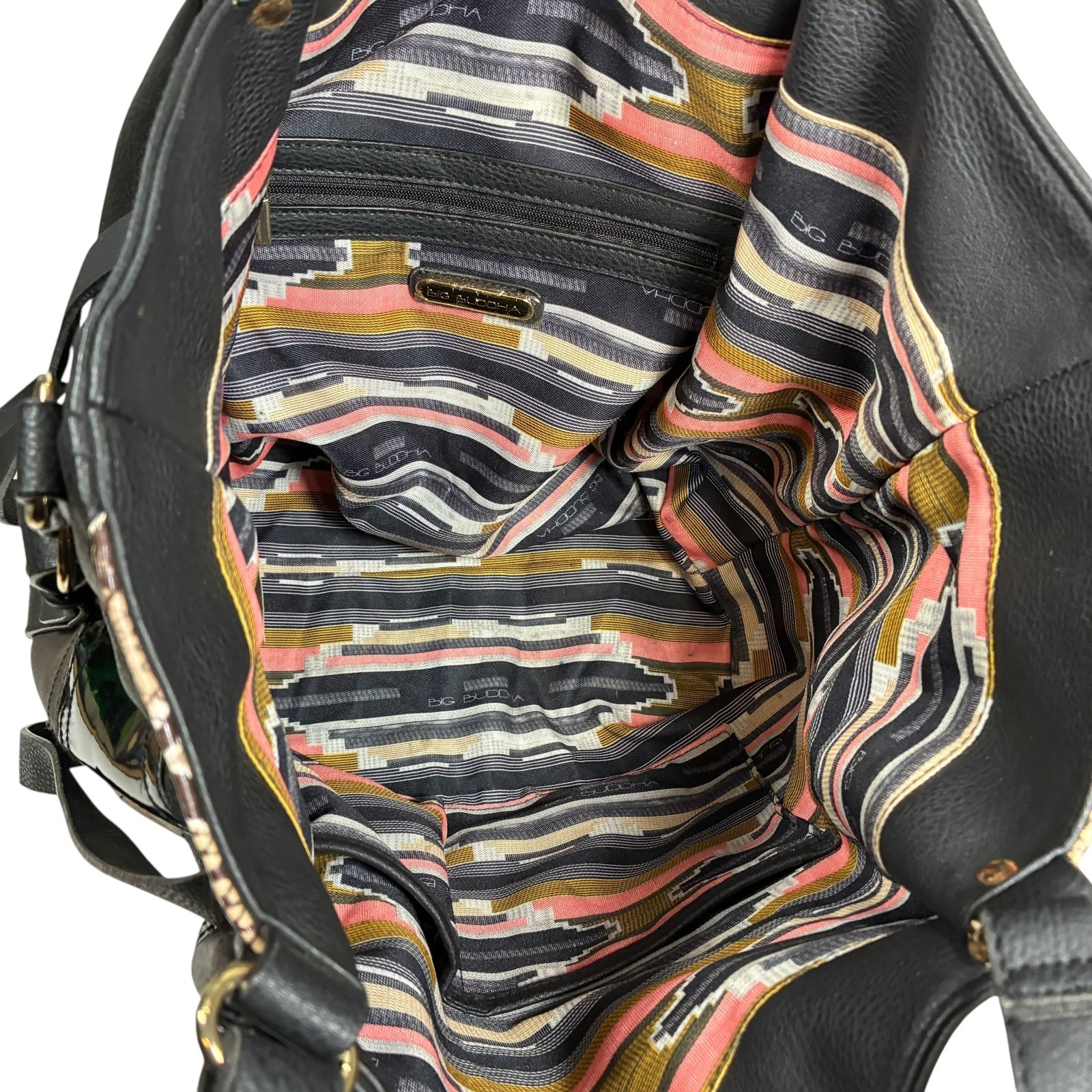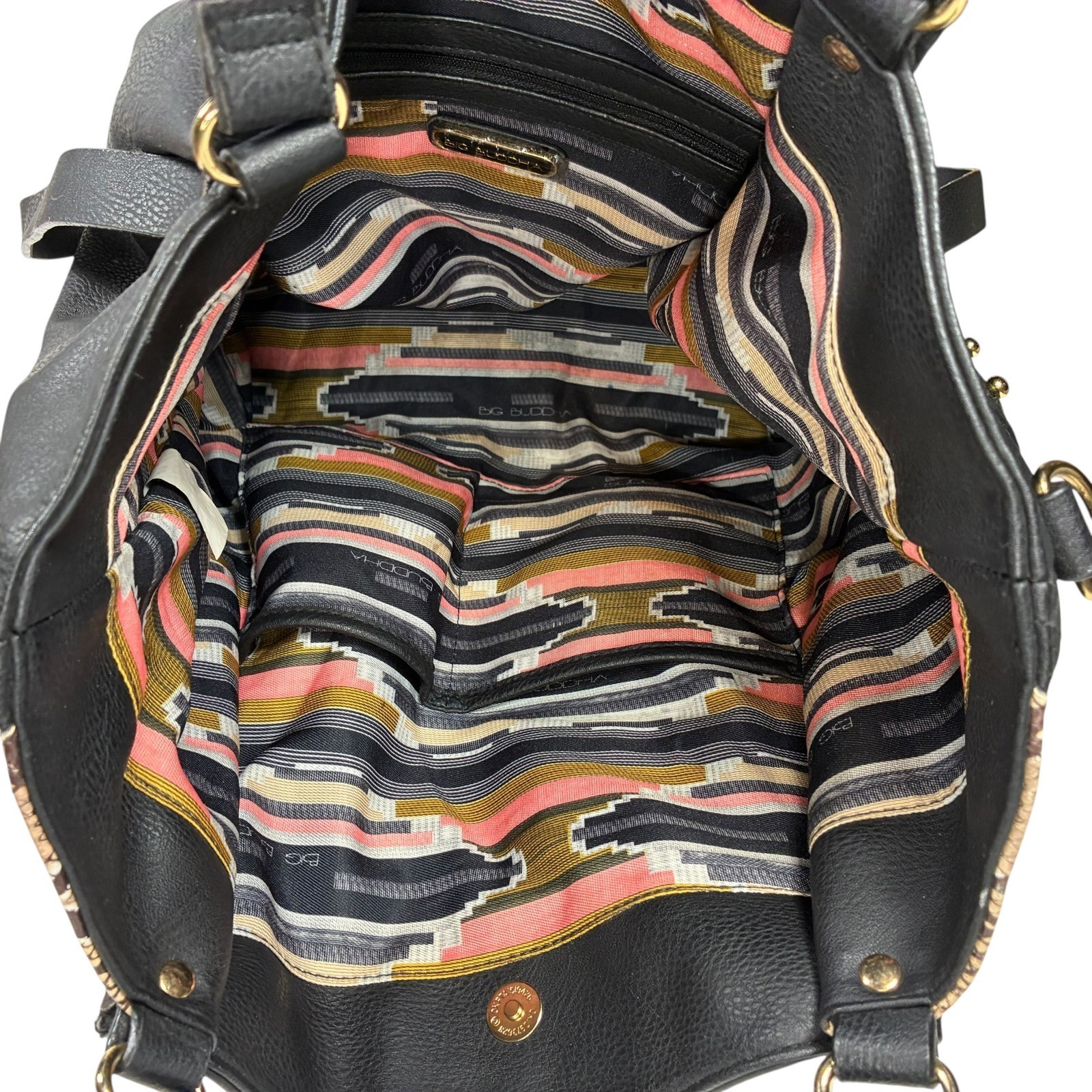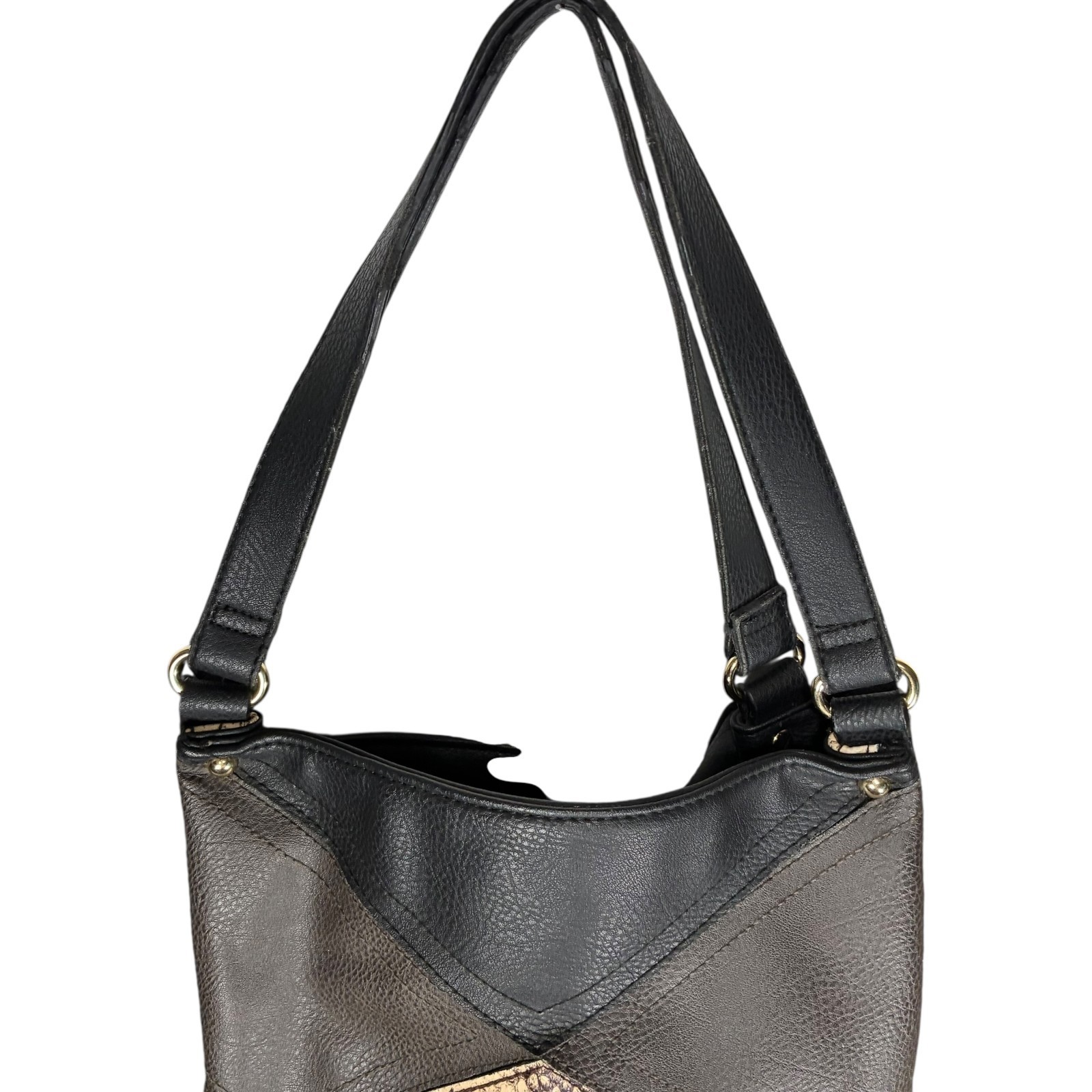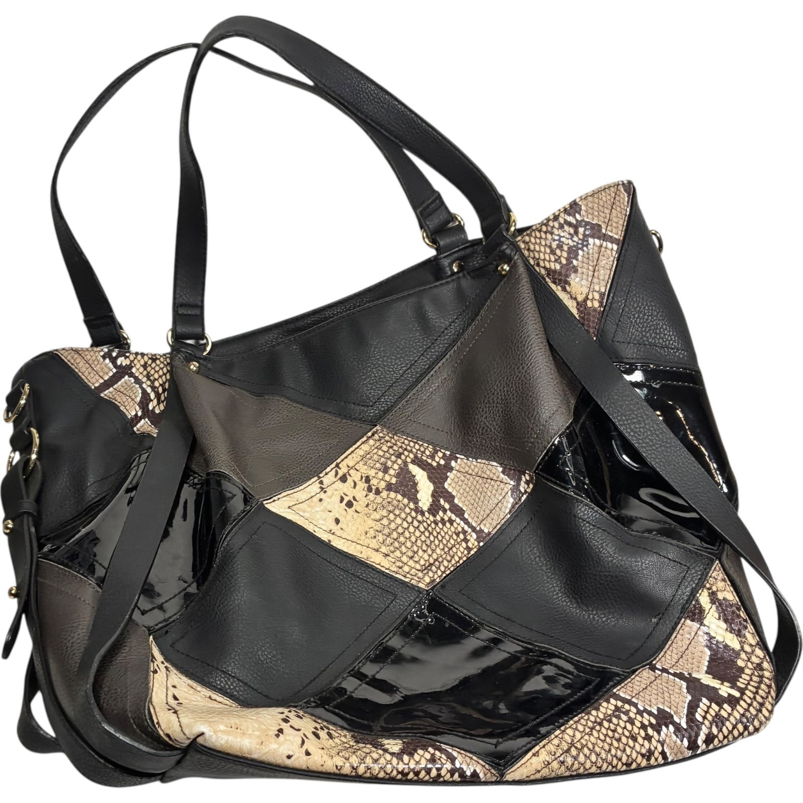 Big Buddha Patchwork Tote Faux Leather Matte Shiny Black w/Snake print 14x13x6 inches