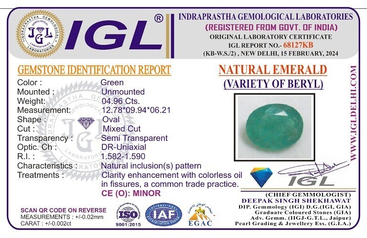 Natural Emerald / Panna - Zambian Mines - 4.96 carats - Lab Certified