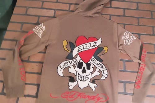 Brand new zip-up hoodie. 100% cotton Authentic and Licensed! Excellent Quality! * Ed Hardy by Christian Audigier * Front and rear embroidered Ed Hardy logo * Graphic print with rhinestone details * Slim fit (size up for looser fit) * 51% Nylon, 49% Wool Measurements: * Medium: pit-to-pit (18") * Large: pit-to-pit (19") * X-Large: pit-to-pit (20") * 2X-Large: pit-to-pit (22")