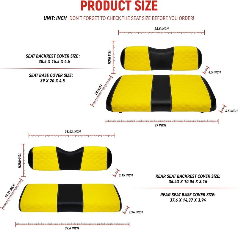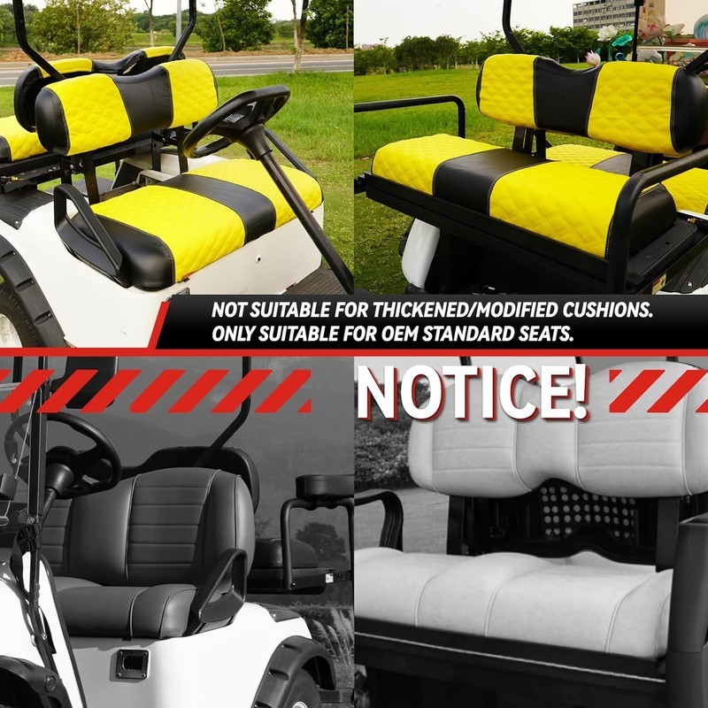 ?Golf Cart Front and Rear Seat Covers?Golf cart front and rear seat covers contain 4pc seat covers. 2pcs suitable for EZGO TXT 1994-2013 OEM ordinary ET Type front seat cushion and 2pcs suitable for aftermarket universal flip rear seat cushion, not for the modified or luxury thick seat cushion. Please measure your seat before ordering. There will be a little differences between the real size and the manual measurement.