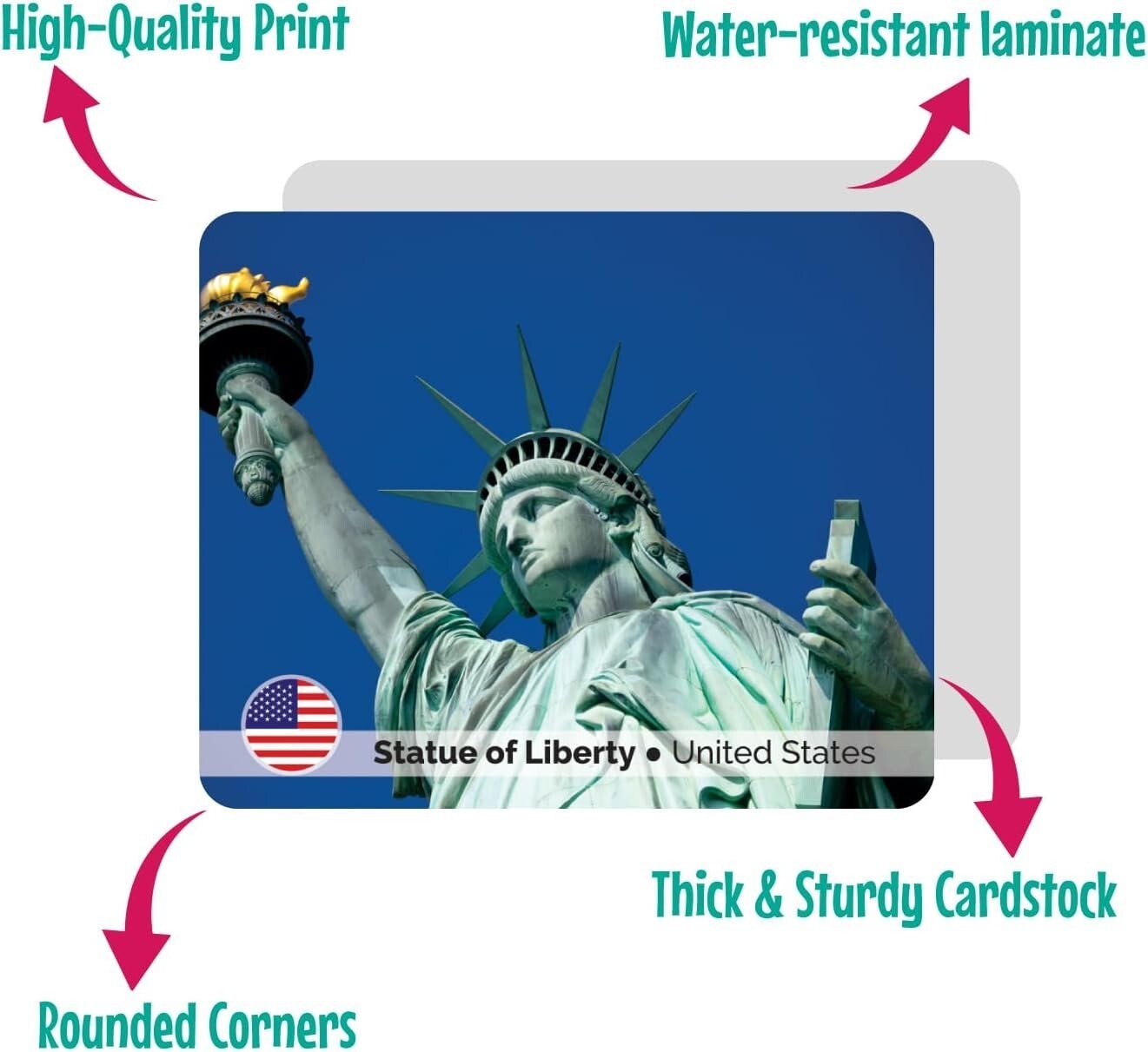 Explore the world from home with this set of 100 cards showcasing iconic global landmarks. Each location is beautifully photographed and accompanied by an educational booklet filled with fascinating facts, making it perfect for families, travelers, and curious minds alike. The laminated, durable cards promote screen-free play, enhancing memory, visual recognition, attention, and cognitive skills for all ages. Sized conveniently at 3.15 x 2.55 inches with rounded corners, they are ideal for on-the-go fun and can be adapted for different age groups. For extra excitement, combine this set with the Flags of the World game to match landmarks with country flags and expand your global adventure. Crafted responsibly with eco-friendly materials, fair labor practices, and a commitment to sustainability. To ensure fast and reliable delivery, we work with multiple fulfillment partners and suppliers. Depending on availability and location, your order may ship from different warehouses or arrive in packaging that varies from item to item. Tracking details are typically provided shortly after shipment, and customer satisfaction remains our top priority. Please note that due to carrier policies and regional regulations, certain items may not be eligible for delivery to specific states or territories.