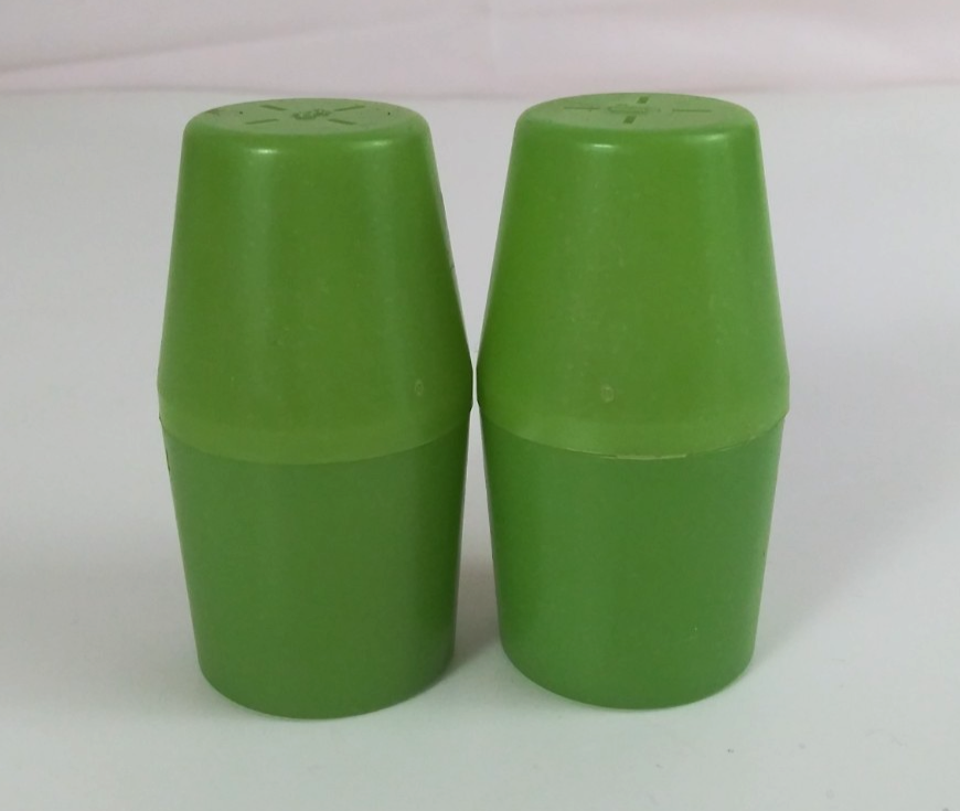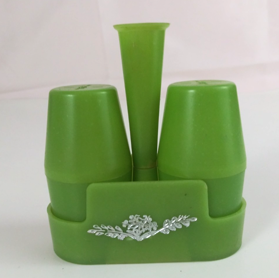 Vintage Green Plastic With Silver Floral Design Holder Salt & Pepper Shakers