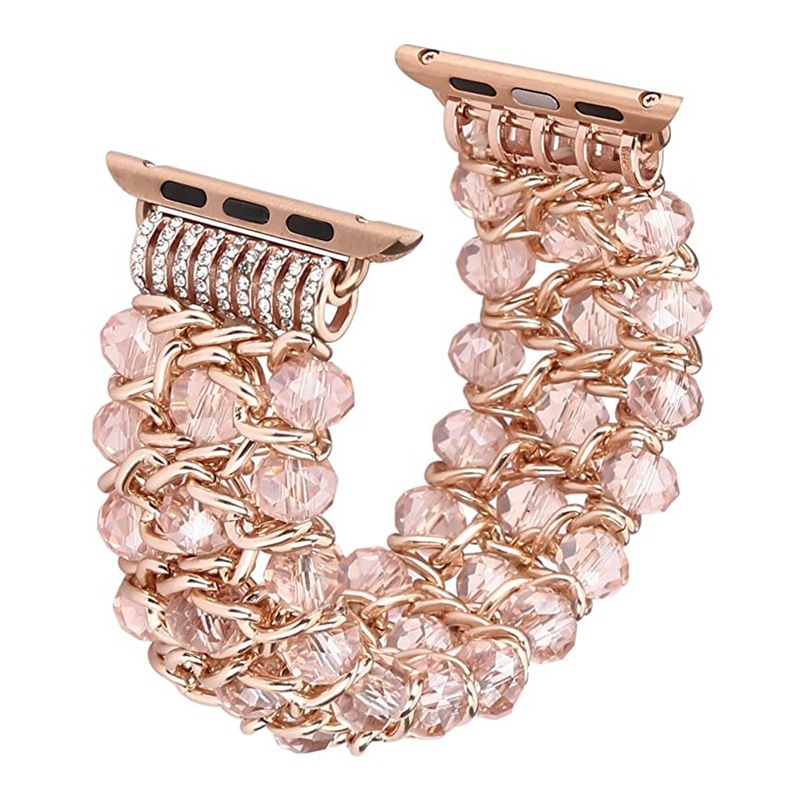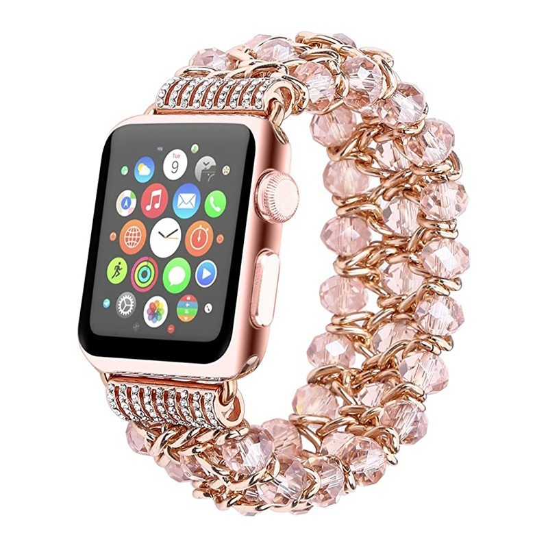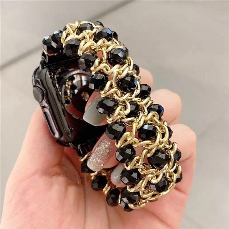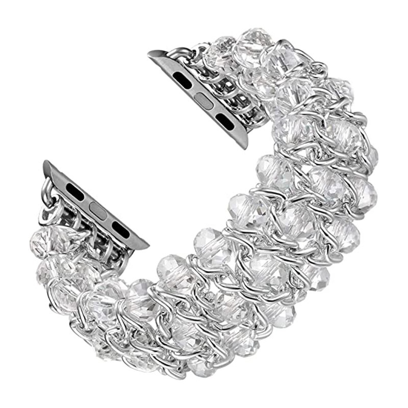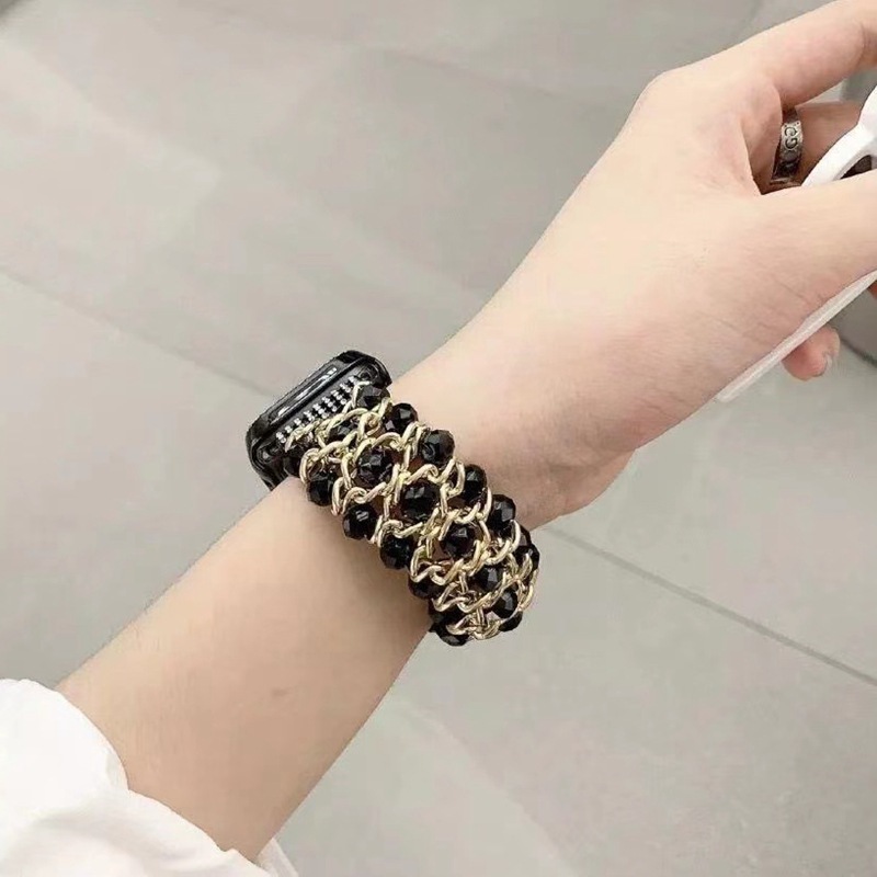 This is a stretchable strap designed for the Apple Watch. It features a combination of metal chains and multi-colored glittering crystal beads. Both ends of the strap are equipped with metal connectors specifically for the Apple Watch. It combines a sense of style with flexibility, adding a glamorous look to the Apple Watch. It is highly adaptable and comfortable to wear.