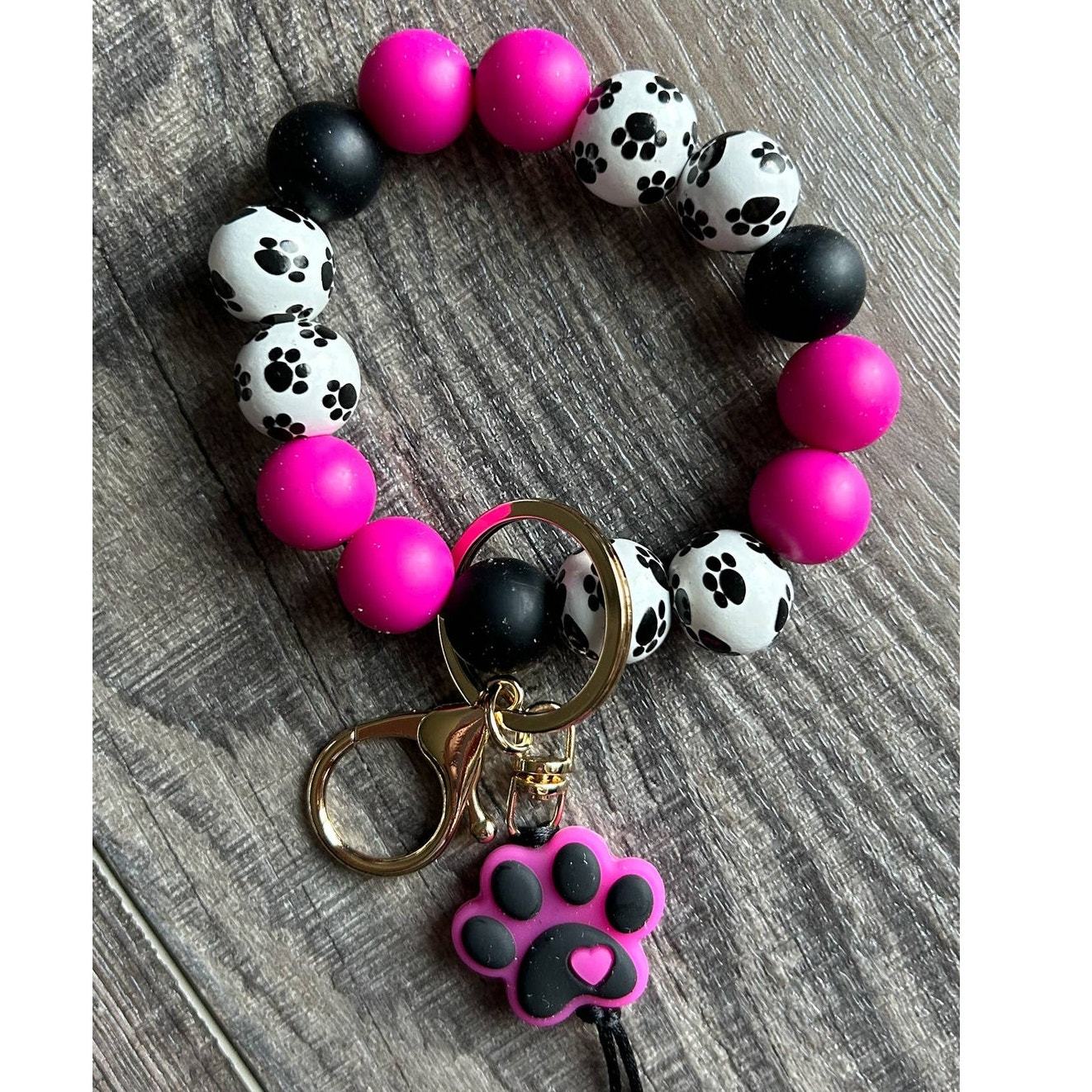 Paw Print Silicone and Wooden Bead Wristlet Keychain Bag Charm Pink
