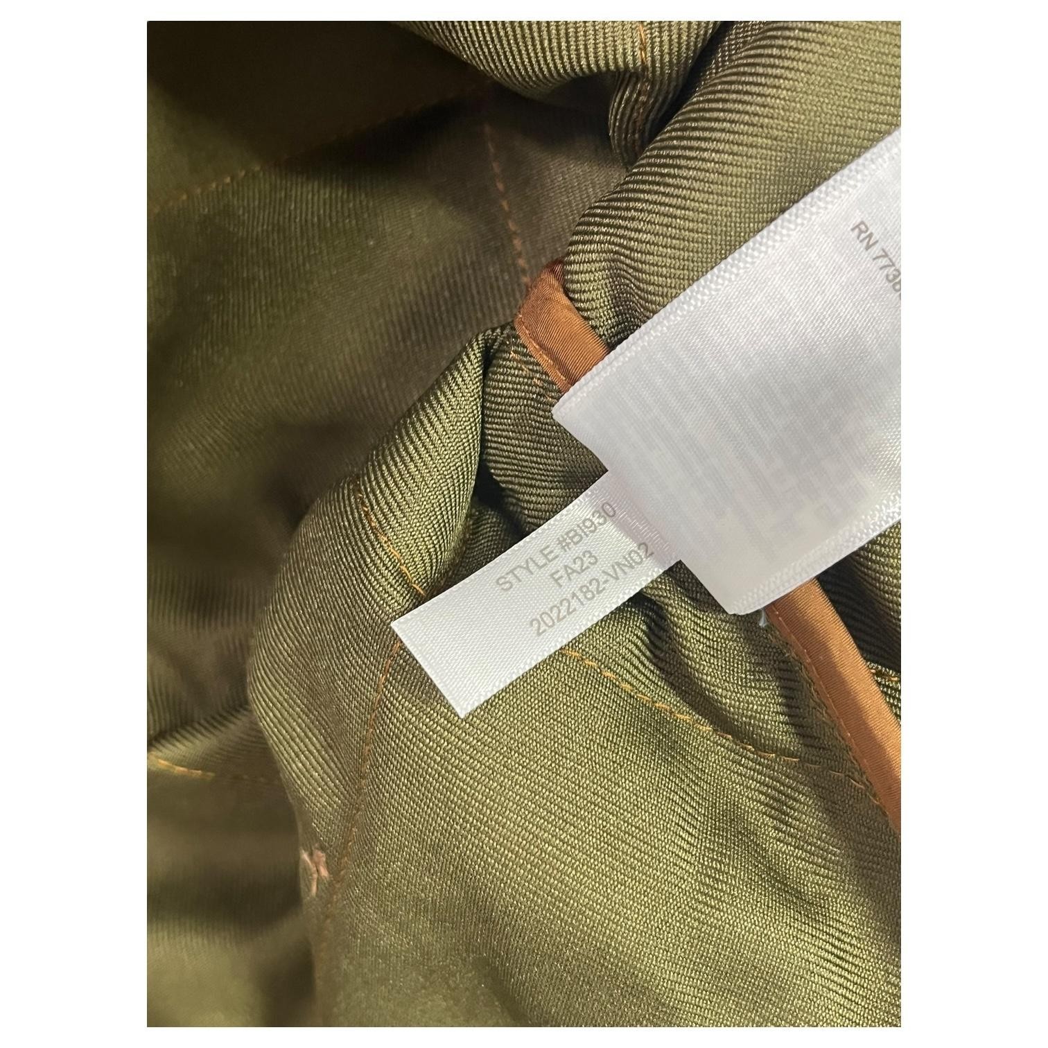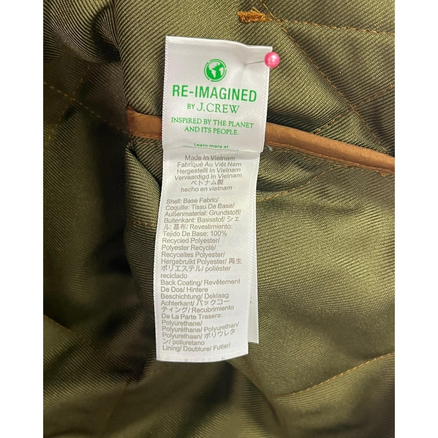 Green olive colored lining, diamond quilted pattern throughout, front zip closure, two front hand pockets, adjustable button waist tabs at back. Fair Trade Certified factory. Re-Imagined by J.Crew sustainability tag present.