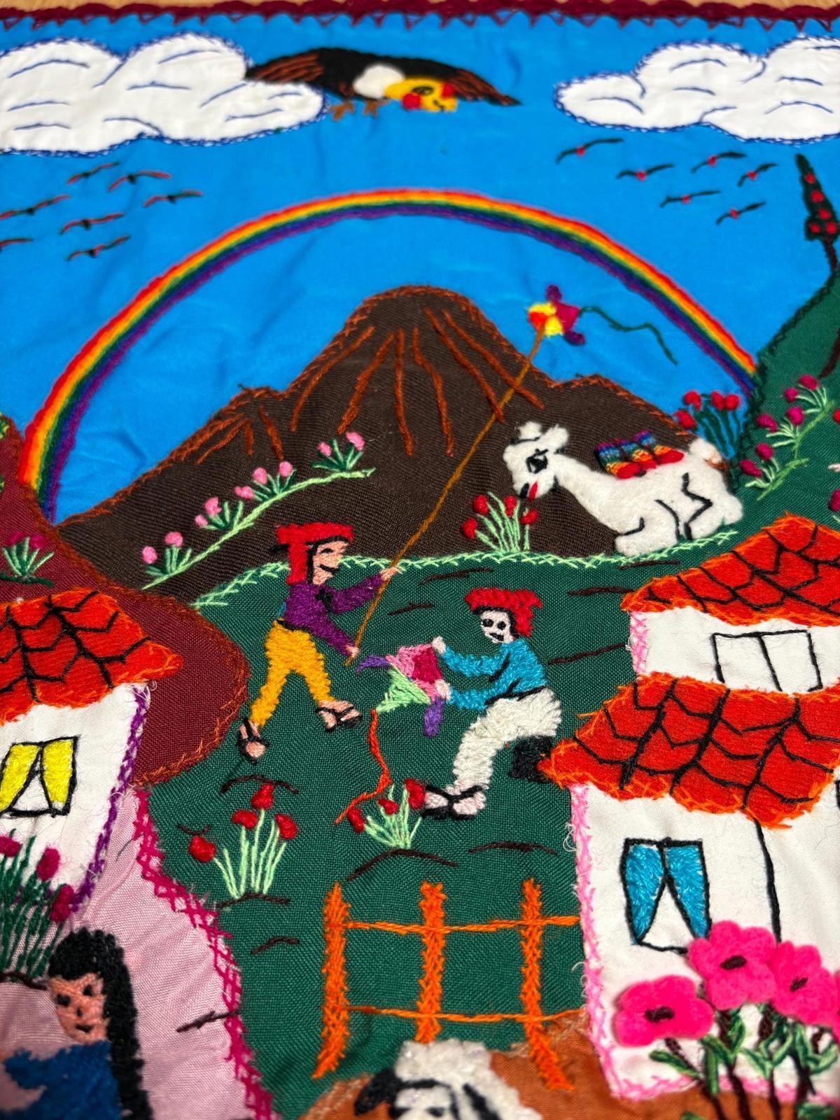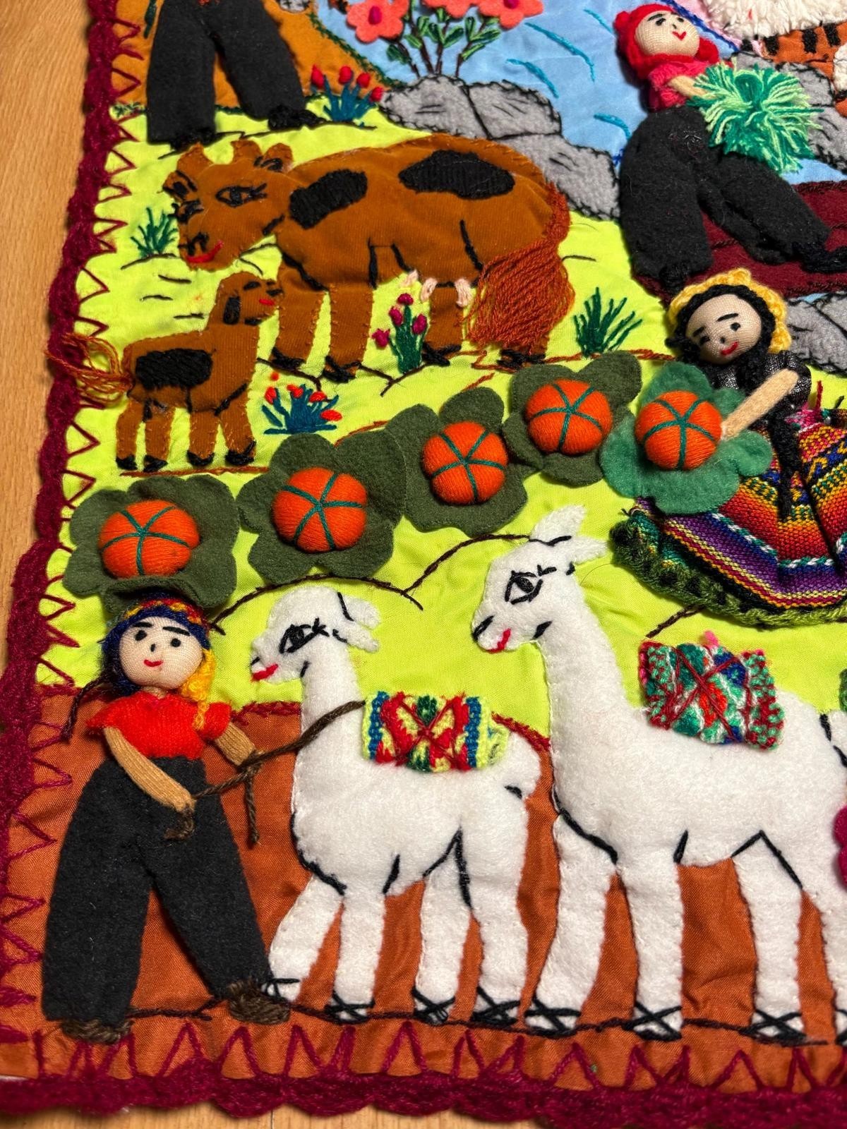 Boho Arpillera Wall Hanging from Peru 3D Village Embroidered Textile Art 20"x30"
