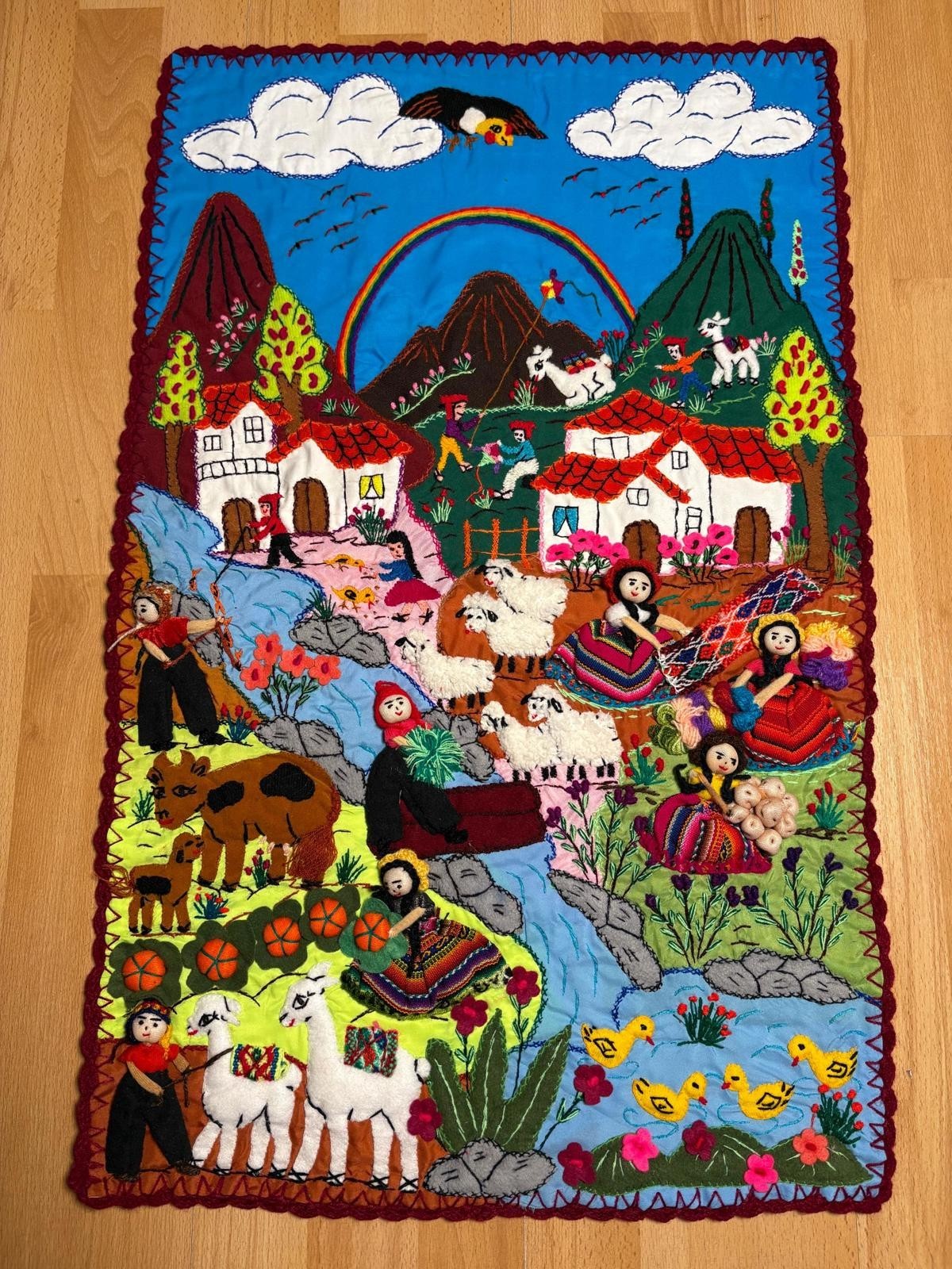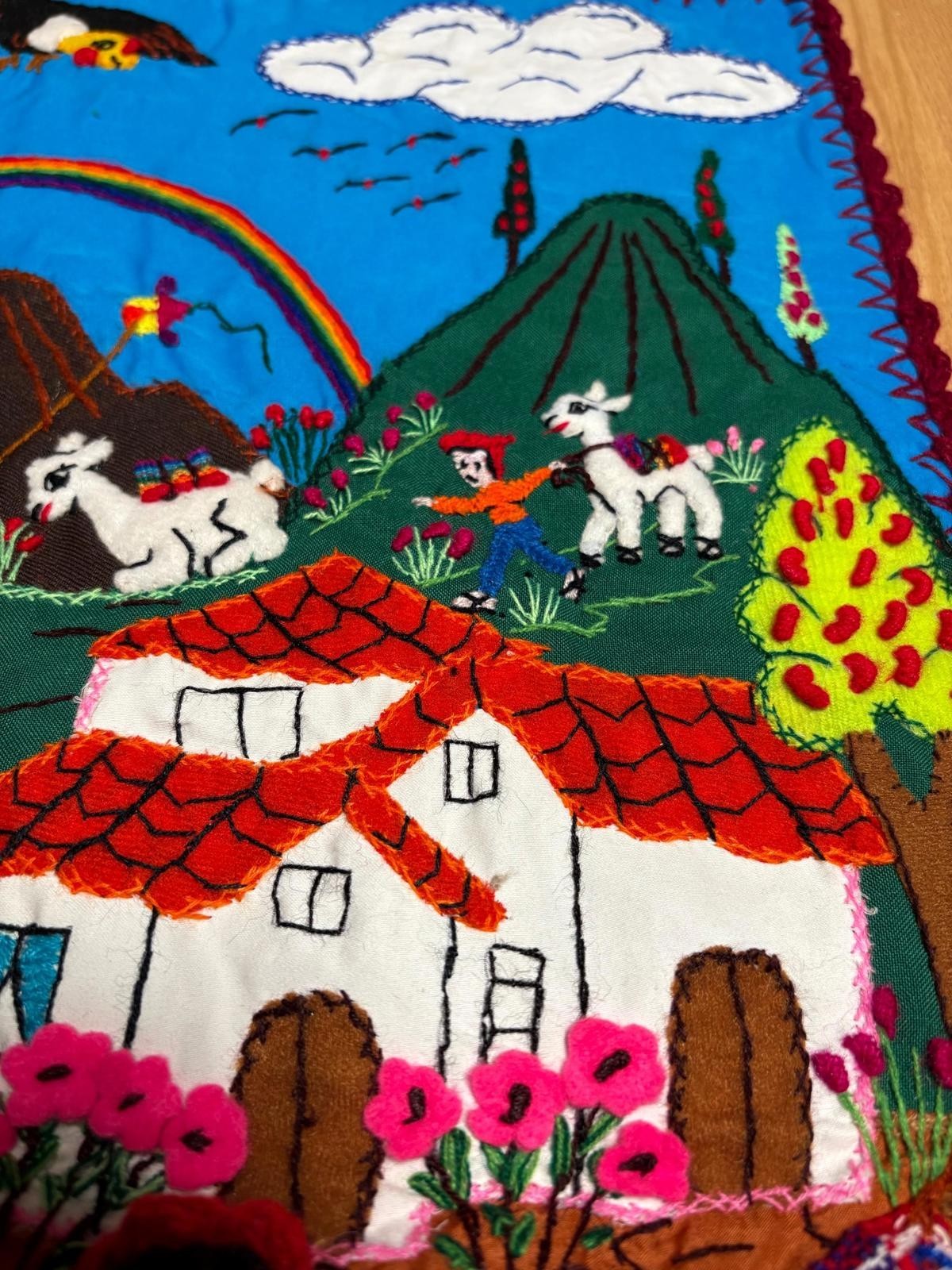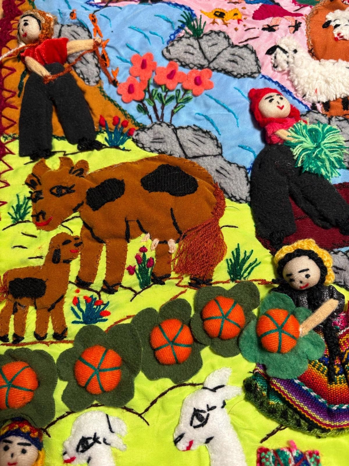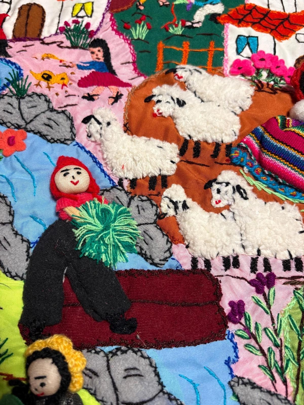 Bring vibrant Peruvian folk art into your home with this one-of-a-kind handmade arpillera wall hanging, crafted by women artisans in the Andes. This 3D textile mural features colorful hand-stitched scenes of daily life in a rural Andean village ? from farmers and animals to markets and mountains ? all made from 100% cotton fabric scraps in true arpillera tradition.