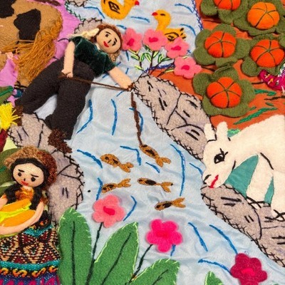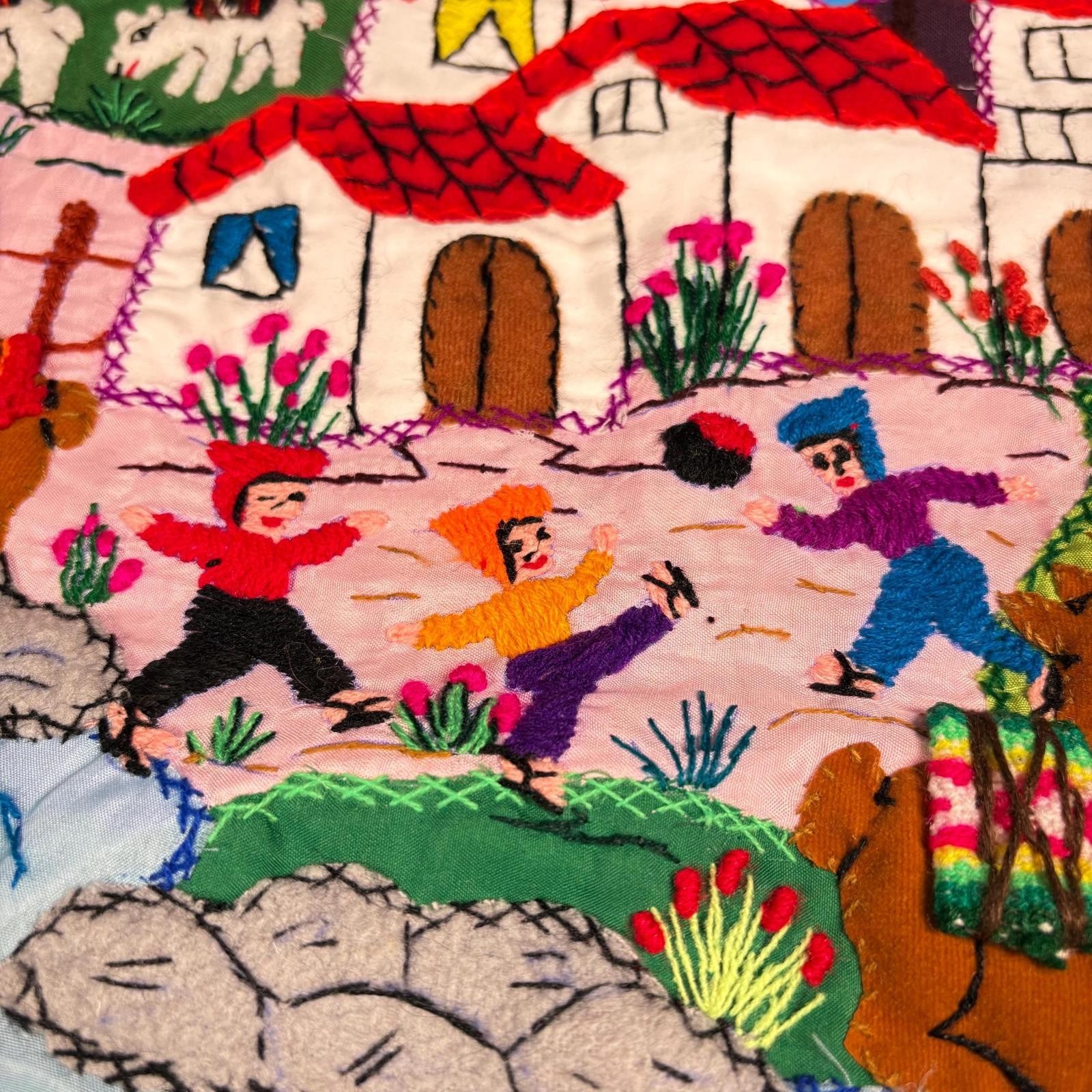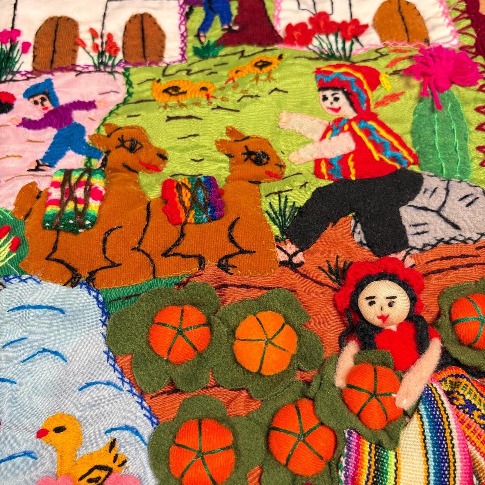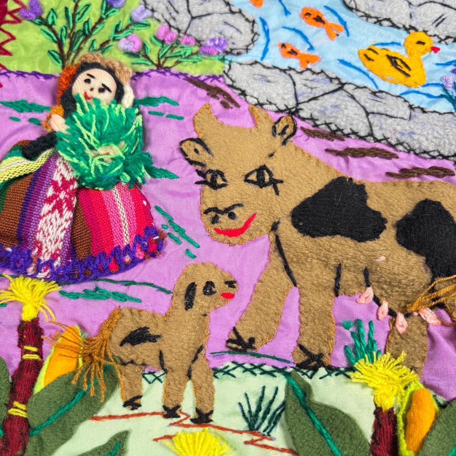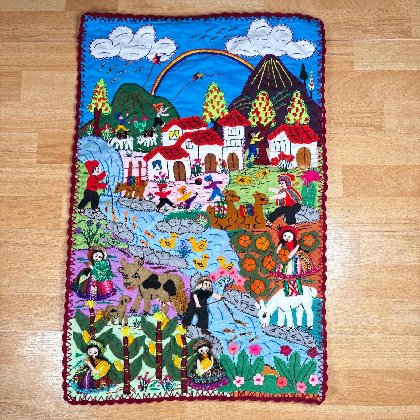 Bring vibrant Peruvian folk art into your home with this one-of-a-kind handmade arpillera wall hanging, crafted by women artisans in the Andes. This 3D textile mural features colorful hand-stitched scenes of daily life in a rural Andean village ? from farmers and animals to markets and mountains ? all made from 100% cotton fabric scraps in true arpillera tradition.