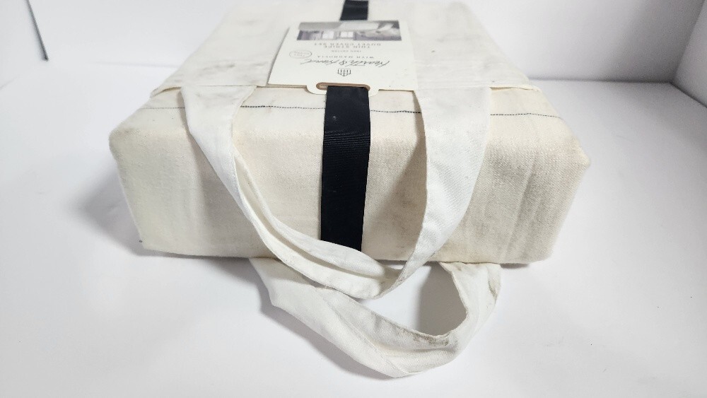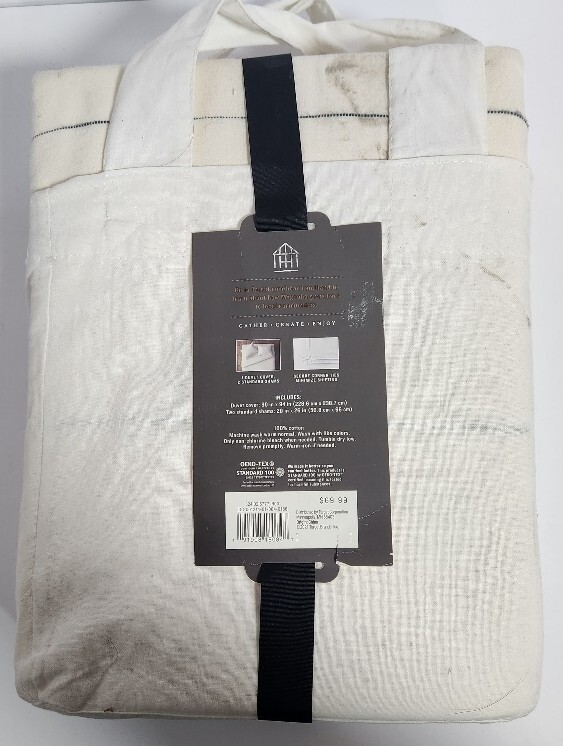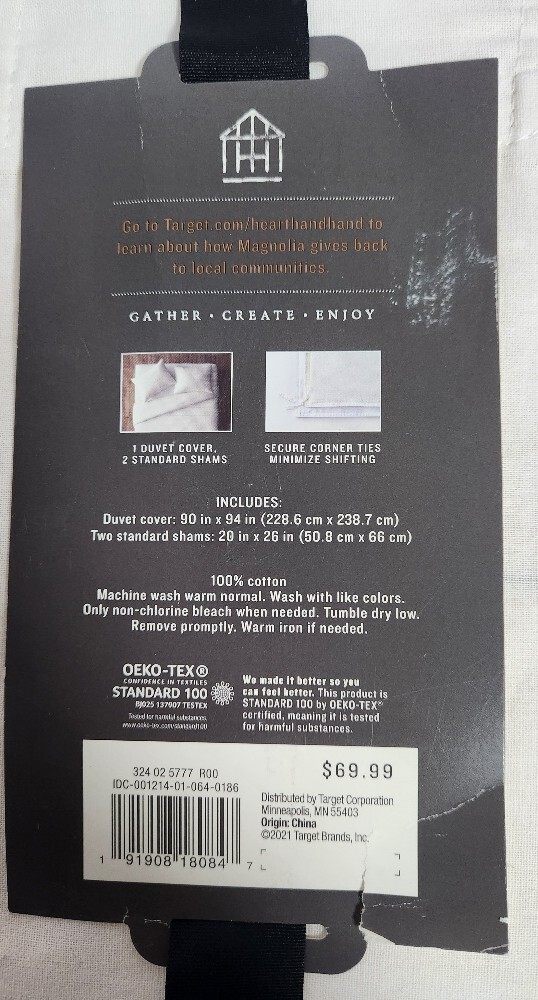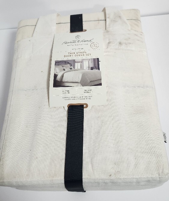 The Hearth Hand? Thin Stripe Duvet Sham Set includes a duvet cover and two pillowcases in a three-piece set. The set features a striped pattern in sour cream and railroad gray, designed for a Full Queen size bed. Made of 100% cotton, this duvet cover set is machine washable, making it easy to care for. Perfect for the bedroom, this set by Hearth Hand with Magnolia offers a stylish and cozy addition to your bedding collection.