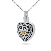 Crafted from quality sterling silver, this heart-shaped keepsake features a warm citrine gemstone, honoring November birthdays with lasting beauty. It securely holds a small portion of remains, offering a meaningful and enduring tribute.