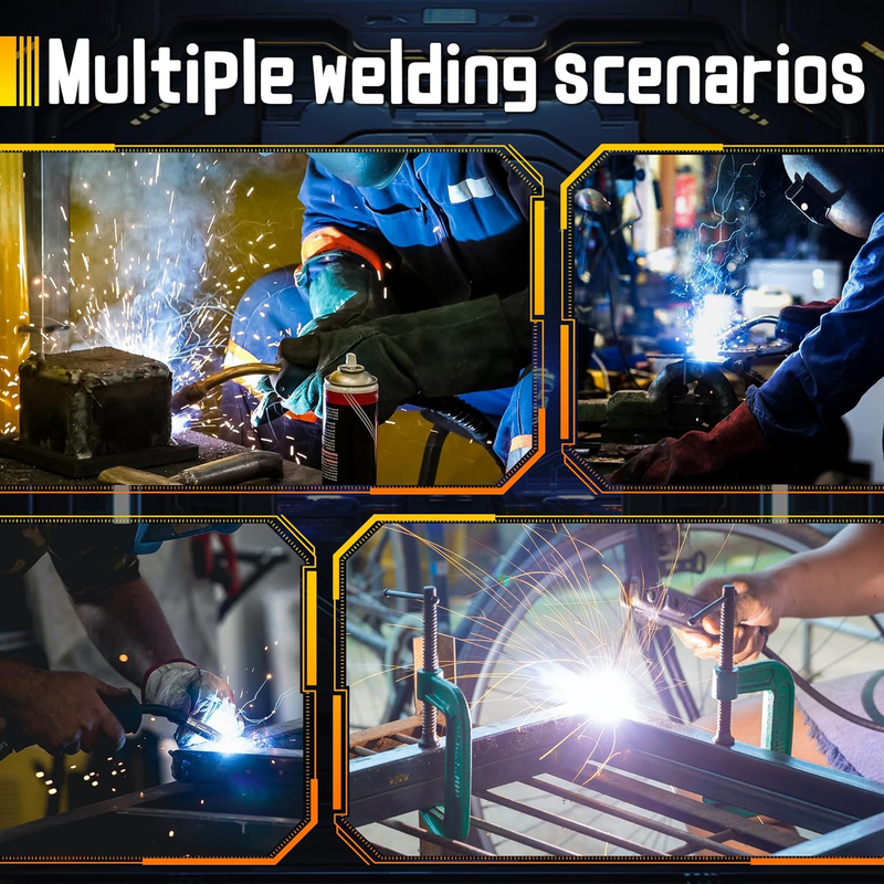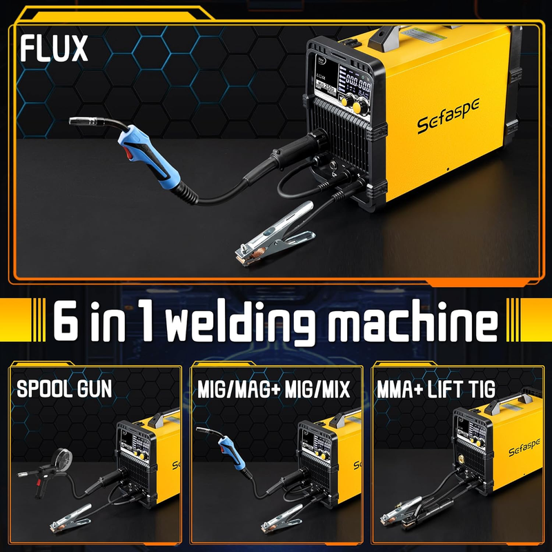 6-IN-1 MIG WELDER: Our 6-in-1 mig welder is designed to handle a wide range of welding processes including Gas MIG, Gasless Flux Core, Stick/MMA, Lift TIG, and is compatible with an optional spool gun connector, making it suitable for various welding requirements(TIG GUN and SPOOL GUN not included, Spool guns can only be used with 7-pin male plugs and Euro connectors.)
