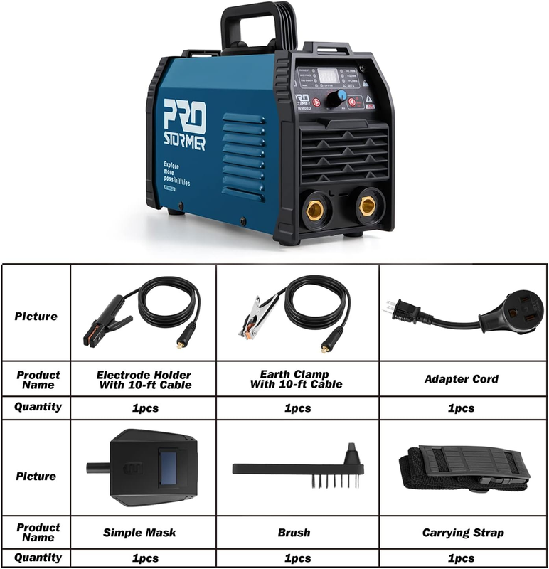 Package : 1 x Stick welder ,1 x Electrode Holder with 10 feet Cable, 1 x work Clamp 10 feet Cable , 1x Power Cord , 1 x Brush and Hammer , 1 x mask , 1 x carrying strap , 1 x User Manual