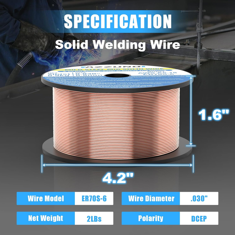 ?2LBS 0.030" MIG SOLID WIRE?: AZZUNO AWS ER70S-6 .030" MIG solid welding wire is easy to use, even for beginners. With SMOOTH feeding and LOW splatter, you'll enjoy a hassle-free gas mig welding experience.