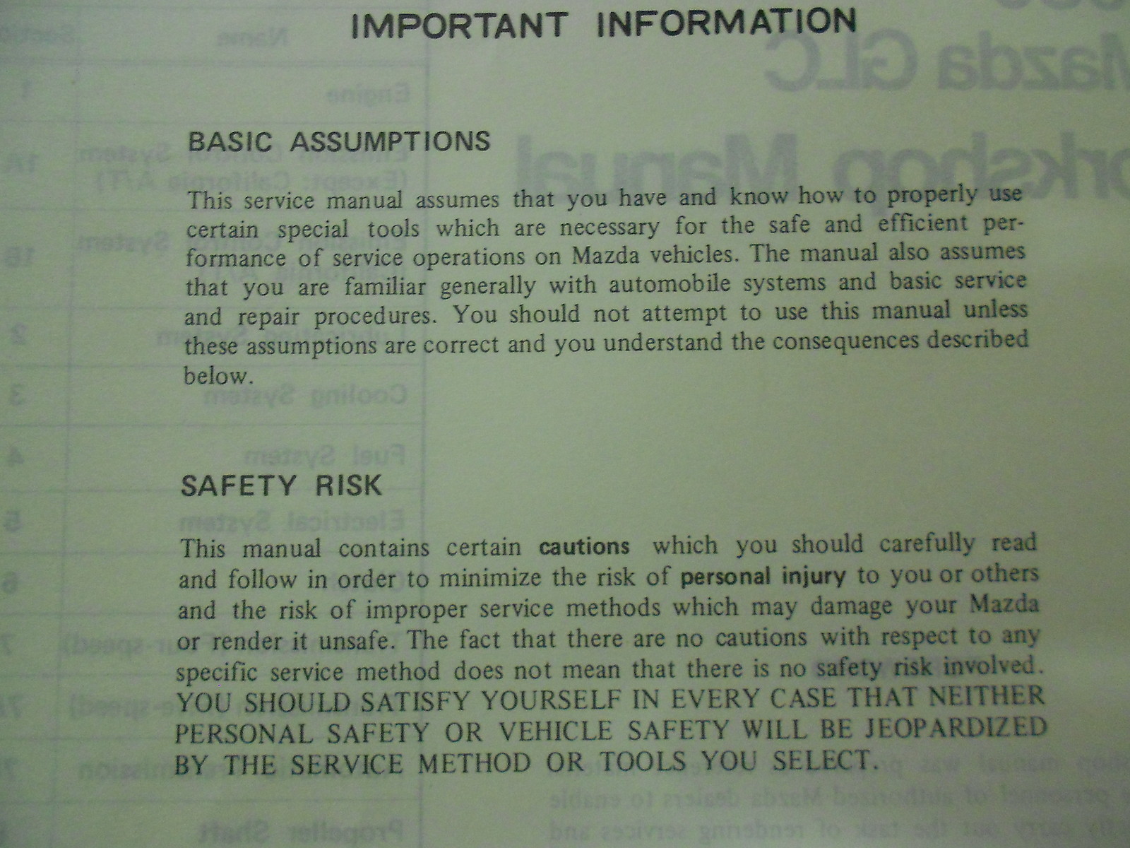 Loads of information and illustrations, covers a lot, no missing pages, step by step Instructions, exploded illustrations and/or diagrams, great manual to have when you own a Mazda GLC and it will keep your vehicle on the road. This manual will save you money in Repairs/Service.