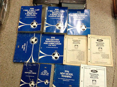 Factory 1996 Ford F-150/250/350/BRONCO/F-Super Duty Powertrain/Drivetrain Service manual, Body/Chassis Service Manual, Technical Service Bulletin Manuals, Specifications Manual, Inspection Manual, Powertrain Control Emission Diagnosis Manuals, Electrical Vacuum Troubleshooting Manual, Facts Book Summary Manual, Owners Guide,