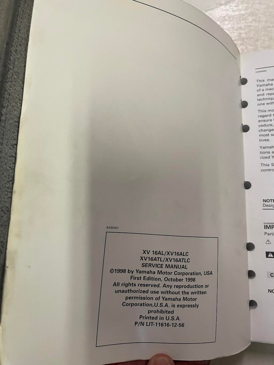 1998-1999 Yamaha xv16al/xv16alc/xv16atl/xv16atlc, manuale di servizio di fabbrica, data a destra della copia 1998, numero di parte LIT-11616-12-56, e aggiornamento tecnico