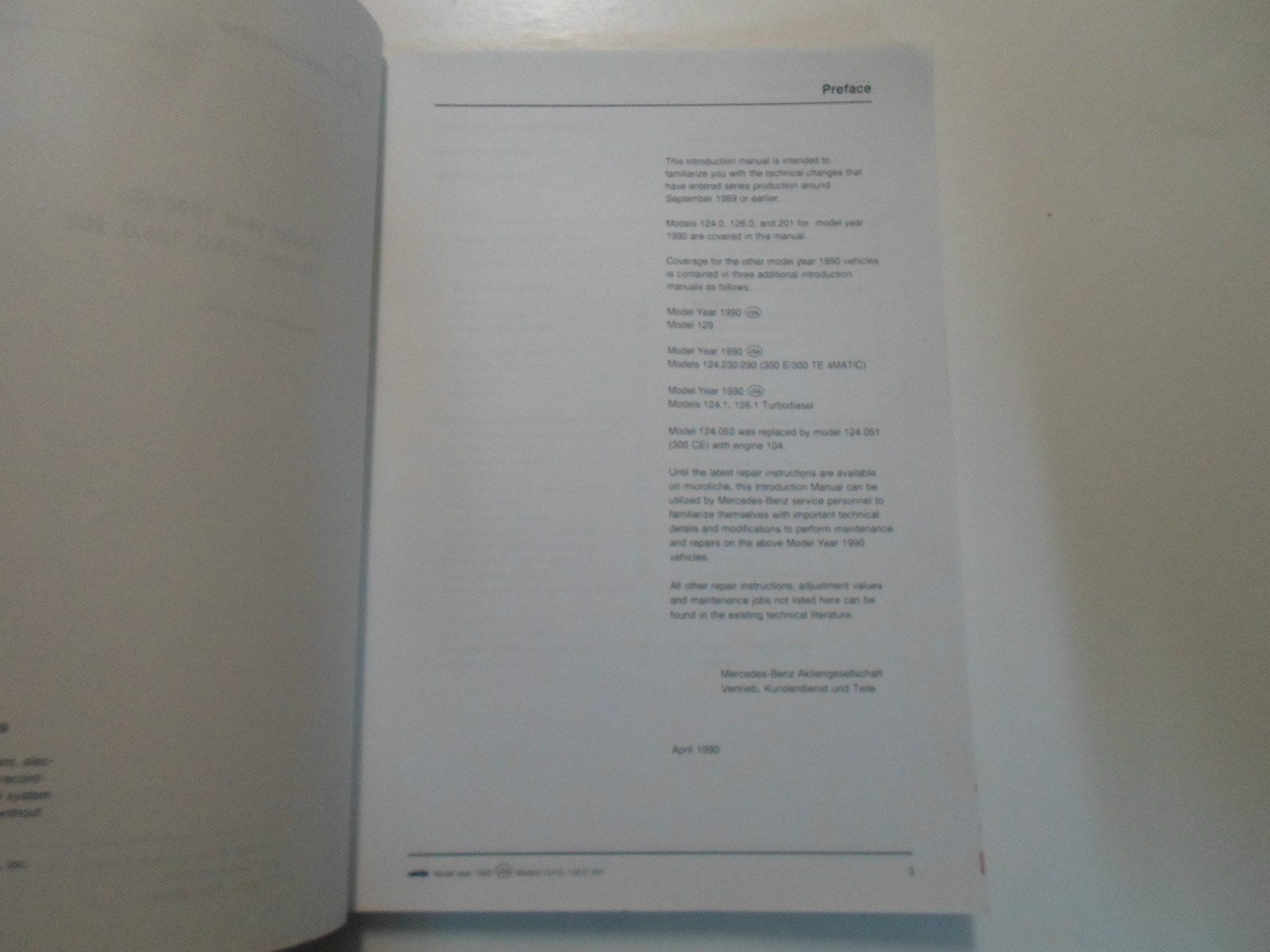 1990 Mercedes Benz Models 124.0 126.0 201 Introduzione Al servizio MANUALE SCRIVERE